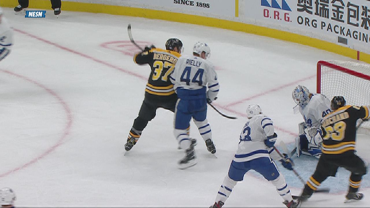 Patrice Bergeron gets to the far post and redirects a shot from David Pastrnak past Garret Sparks, putting the Bruins on the board in the 1st