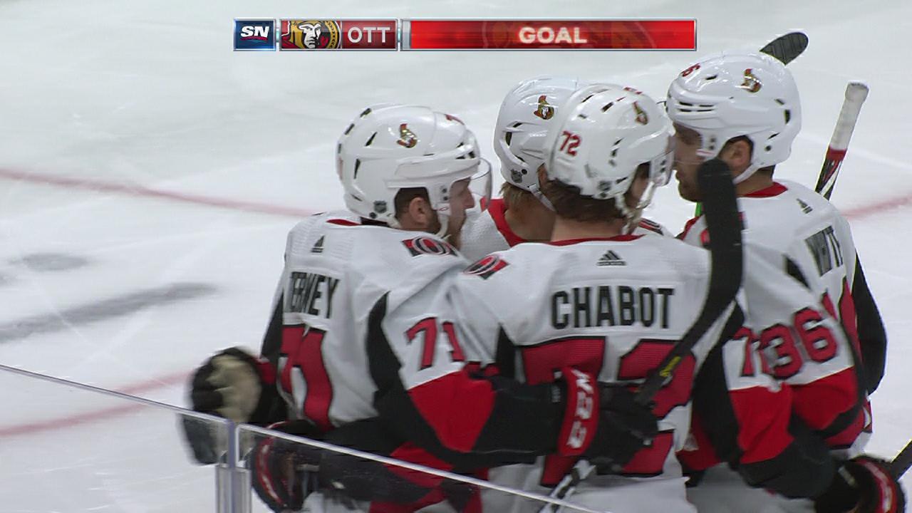 Chris Tierney puts Thomas Chabot's dish into the back of the net to cut the Senators' deficit to 4-2 in the 3rd period