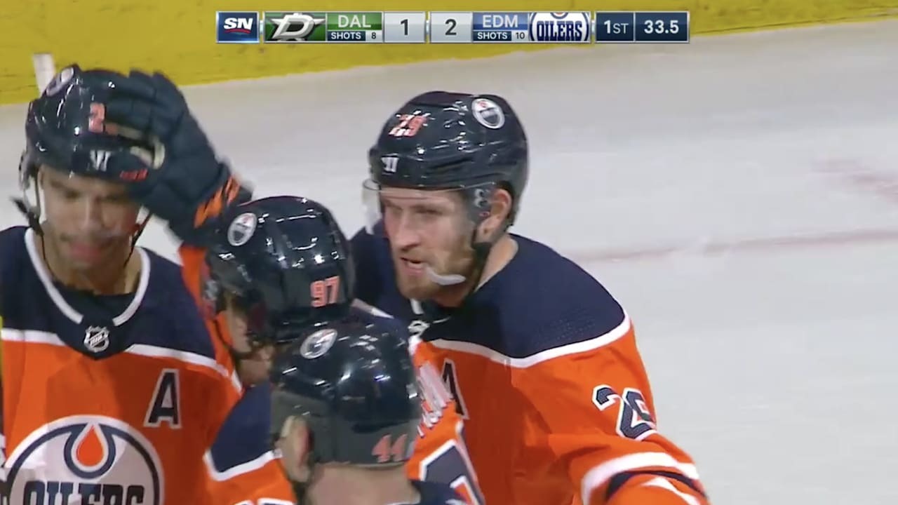 Leon Draisaitl gathers the long rebound and rifles a shot past Ben Bishop to give the Oilers the lead and extend his point streak to 12 games
