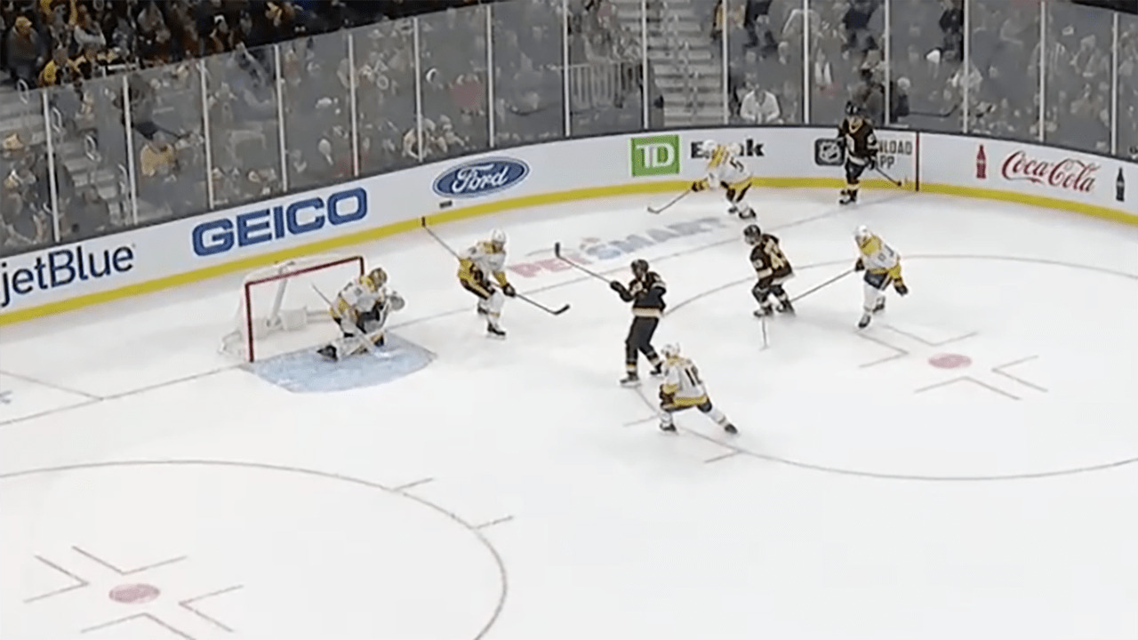Torey Krug slides a pass to Patrice Bergeron, who hammers a one-timer from down low for a power-play goal to give the Bruins a 2-1 lead