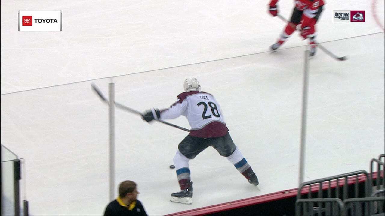 Ian Cole flings a shot from the point into that goes off a defender and past Mackenzie Blackwood, extending the Avalanche's lead to 2-0