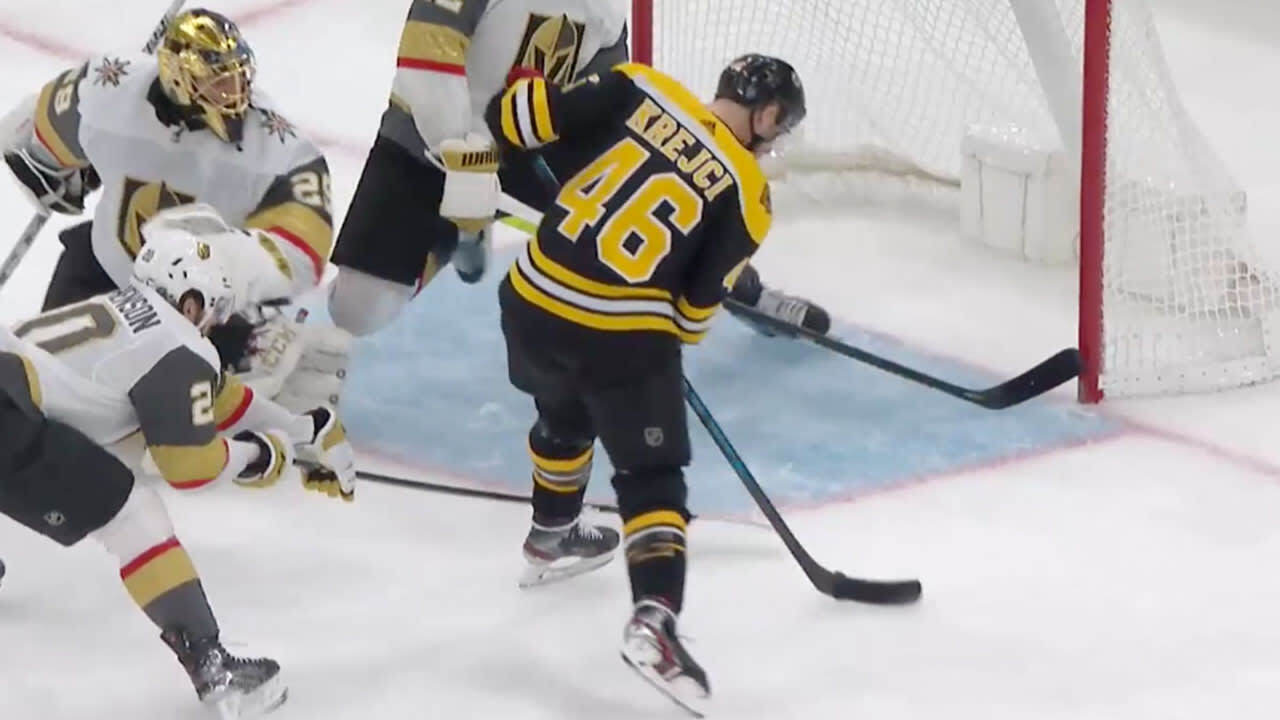 David Krejci tracks down the puck after his redirection is stopped by Marc-Andre Fleury and puts in his own rebound for a 3-2 Bruins lead