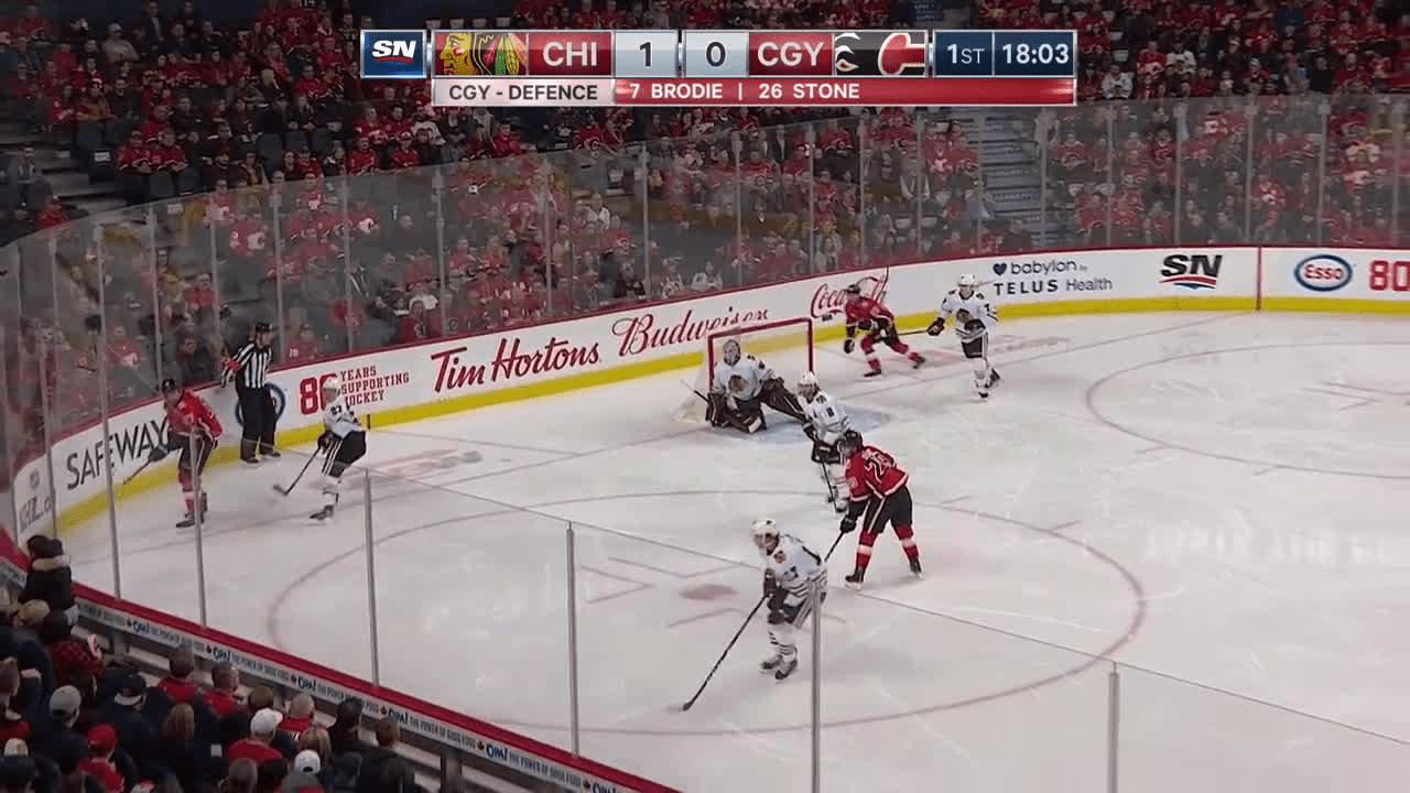 Sam Bennett crashes the net and puts home the cross ice feed from Dillon Dube to tie the game at 1 in the 1st period
