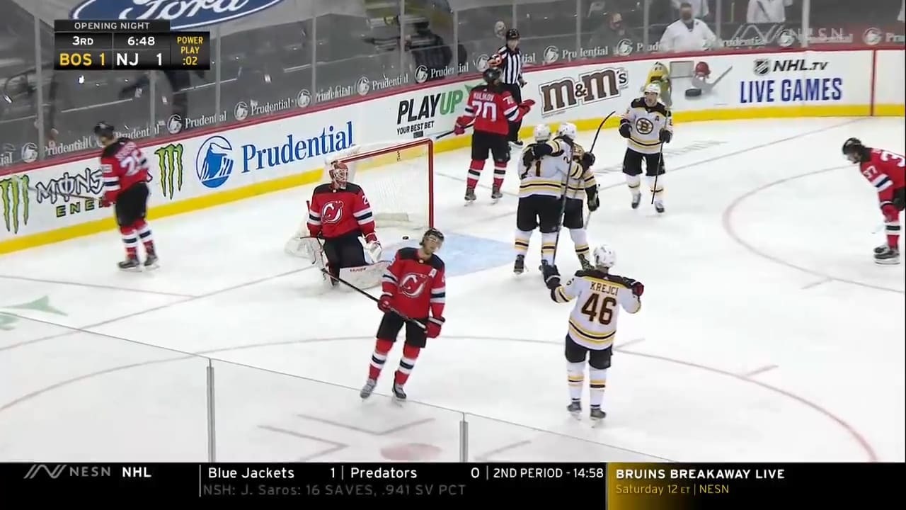 Nick Ritchie puts home a centering pass from Brad Marchand to give the Bruins a 2-1 lead with a power-play goal