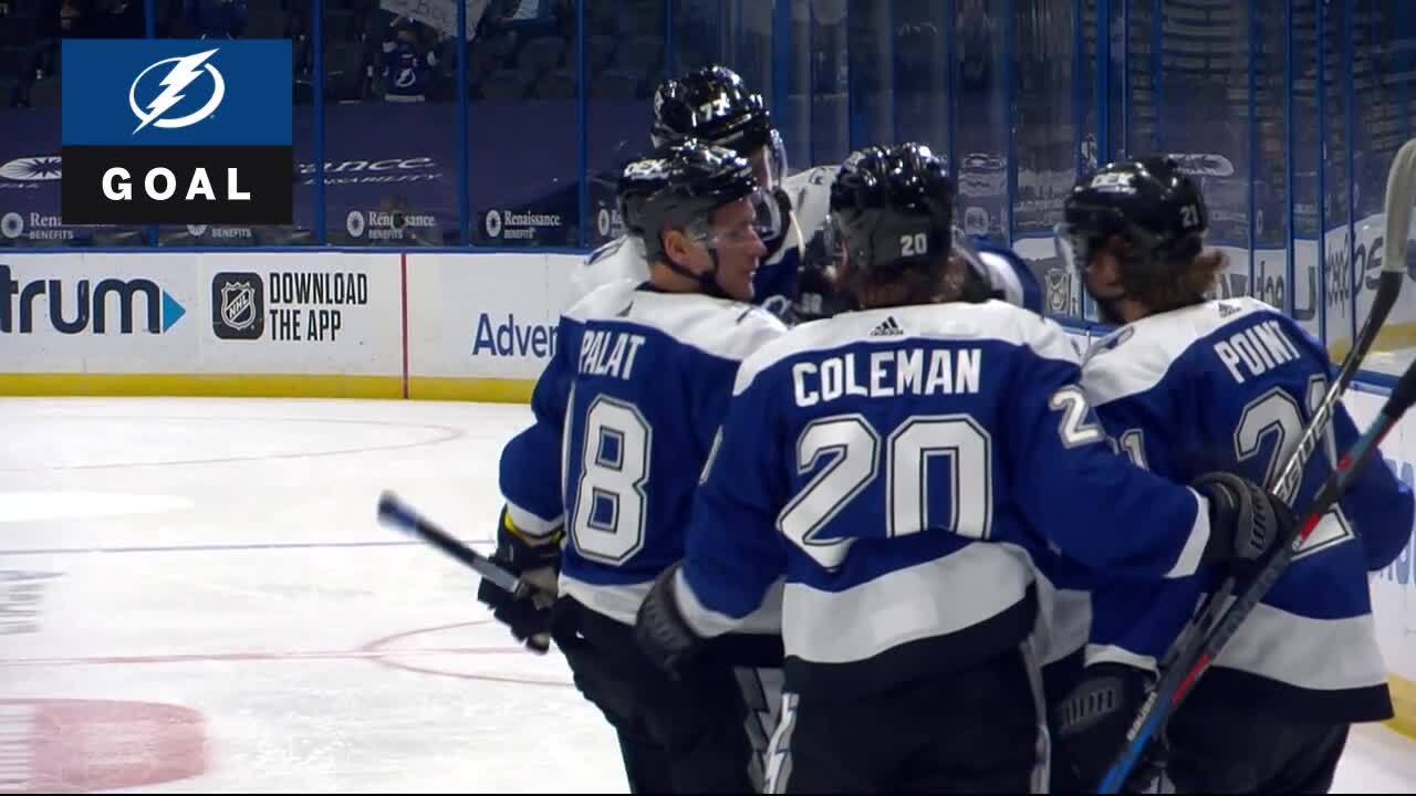 Mikhail Sergachev skates in to the side of the net and sneaks the puck past James Reimer on the short side, evening the score at one a piece