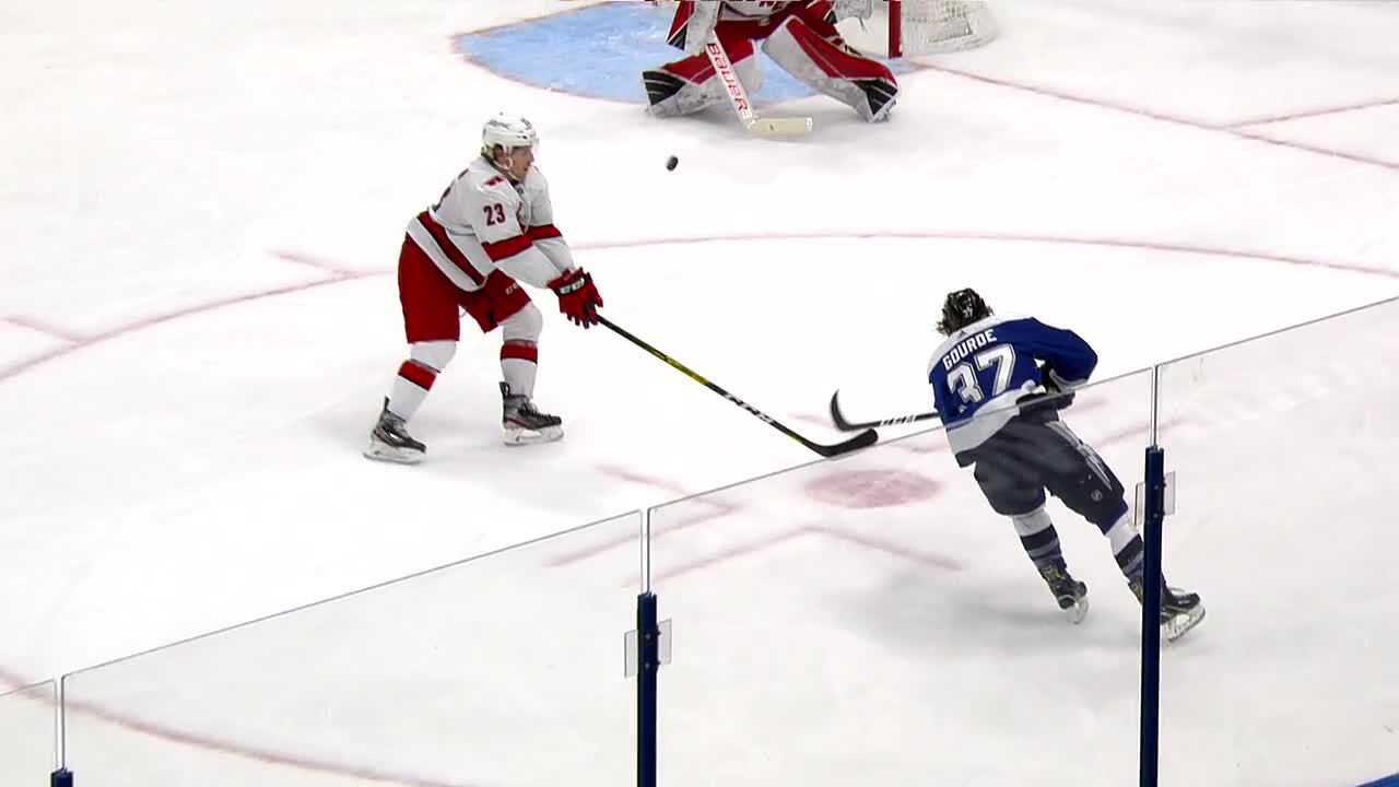 Yanni Gourde skates in and fires a shot from the circle that finds the top corner, giving the Lightning the lead in the 3rd period