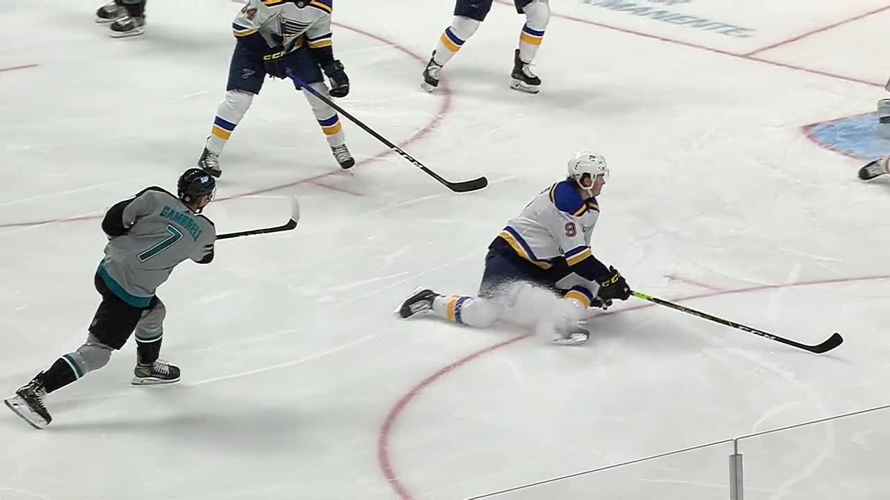 Dylan Gambrell gets the puck in the high slot and fires it into the top corner of the net, giving the Sharks an early 1-0 lead in the 1st