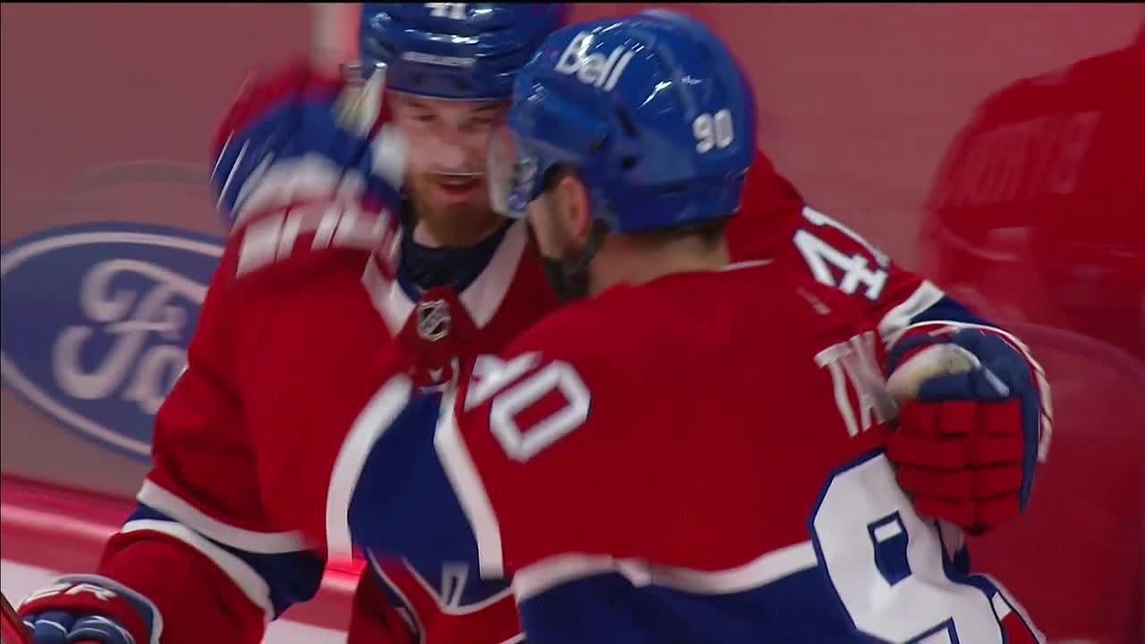 Tomas Tatar backhands the puck into the empty net to extend the Canadiens lead with his second goal of the game