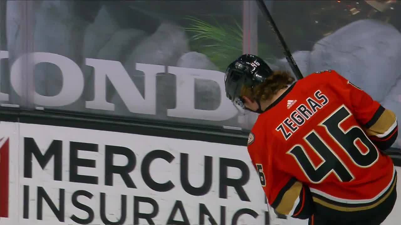 Trevor Zegras puts the puck into the back of the cage after Comtois slid the puck out front, giving the Ducks a 1-0 lead in the 1st period