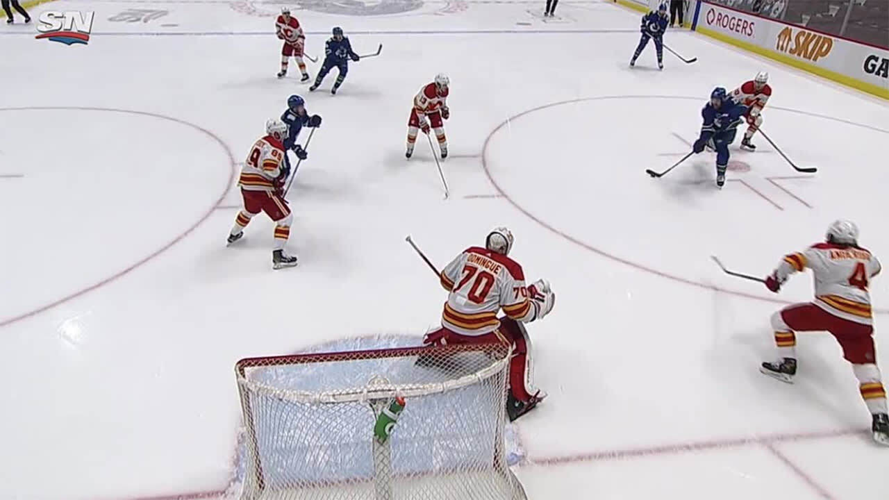 Travis Hamonic sneaks in from the blueline and manages to fling the puck past Louis Domingue to give the Canucks the lead