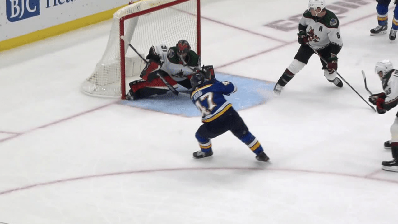 Torey Krug completes a bank pass to Ryan O'Reilly before joining him on a two-on-one rush and sending a wrist shot past Scott Wedgewood