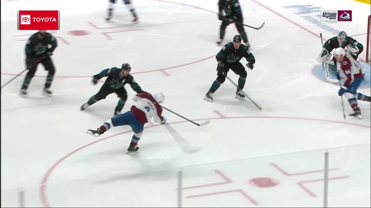 Cale Makar tucks in his own rebound after his initial shot hits off the skates of a Sharks defenseman to make it 3-0 Avalanche in the 2nd