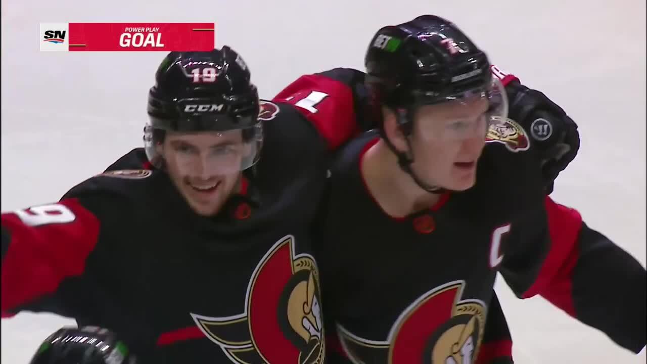 Brady Tkachuk finds the puck in front of the net and dishes to Drake Batherson, who scores a power-play goal to make it 3-3 in the 2nd period