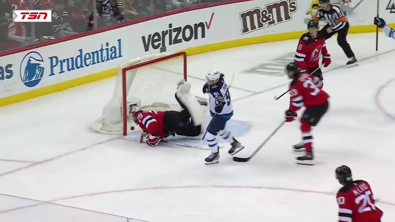 Cole Perfetti puts home a rebound to kick off the scoring, giving the Jets a 1-0 lead in the 1st period