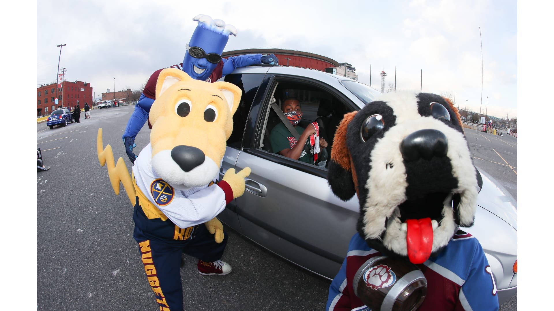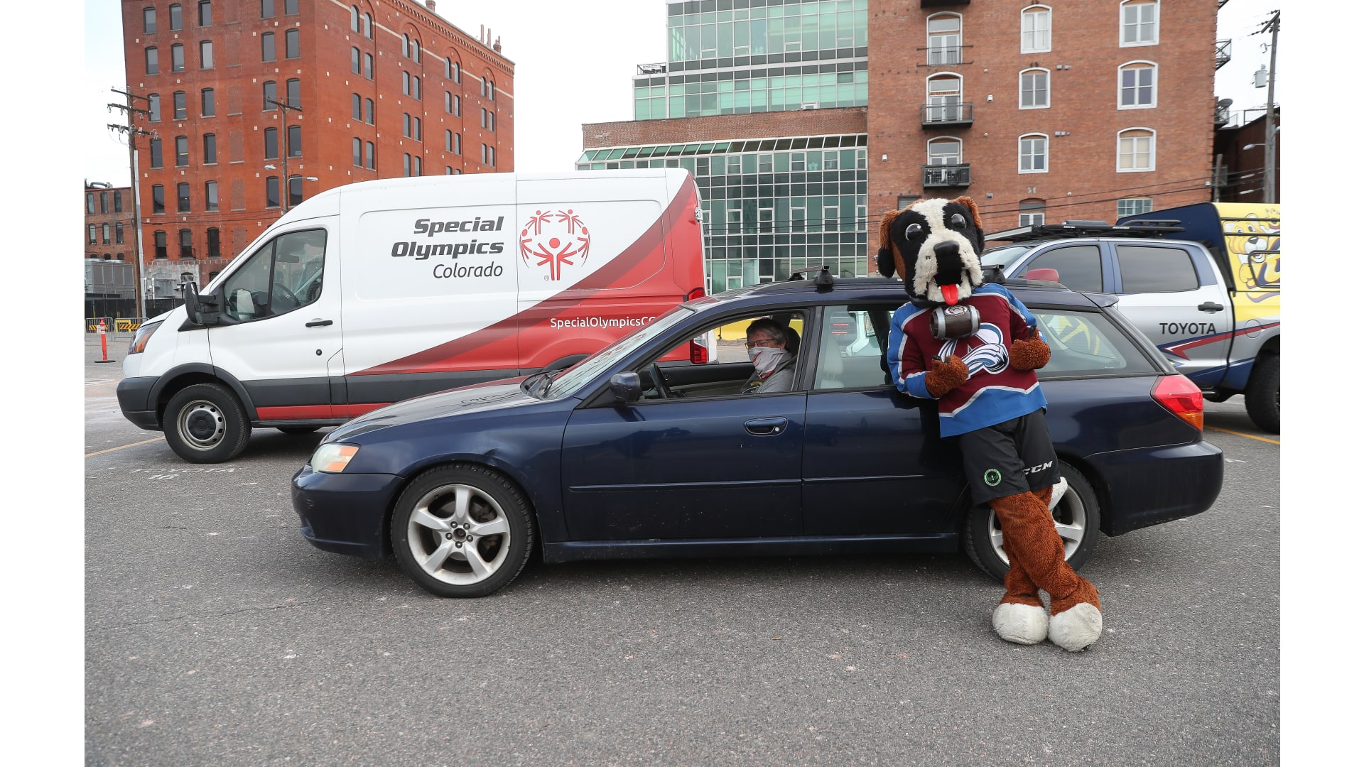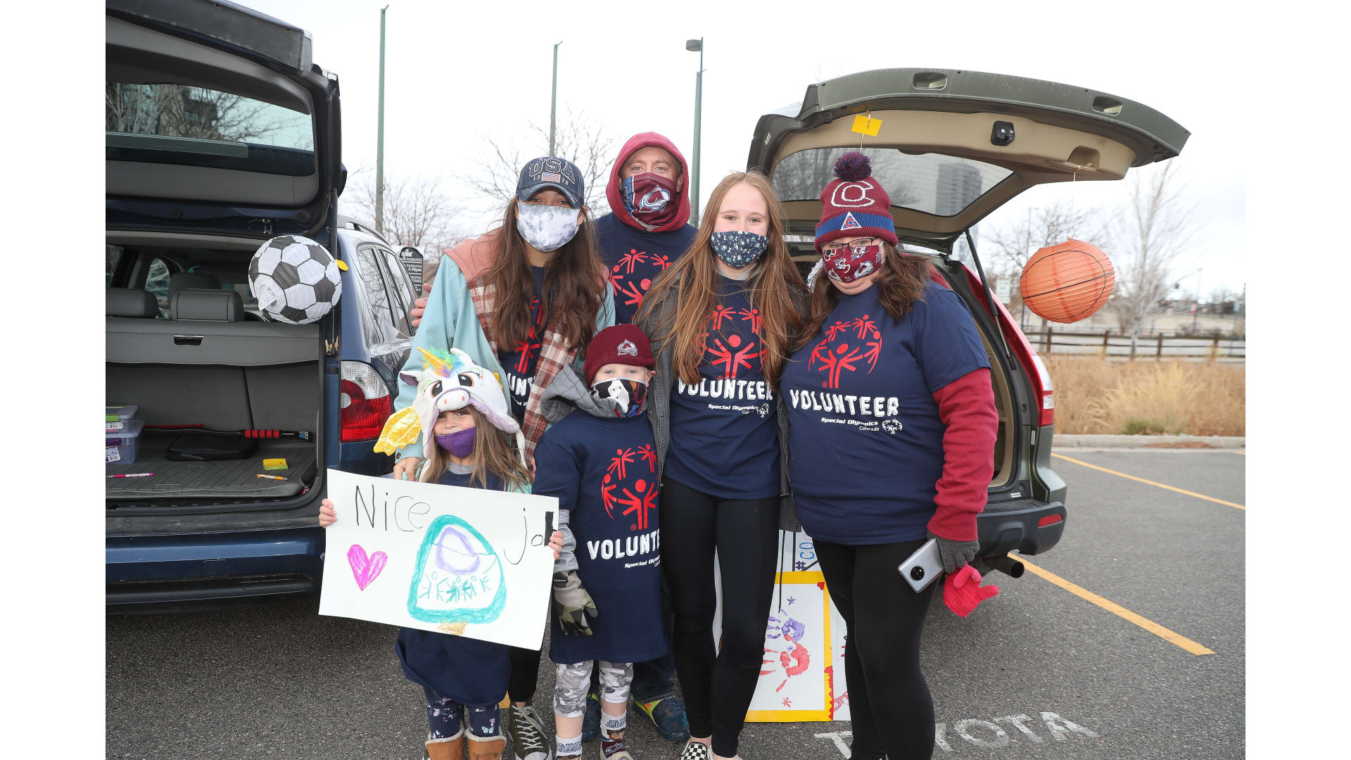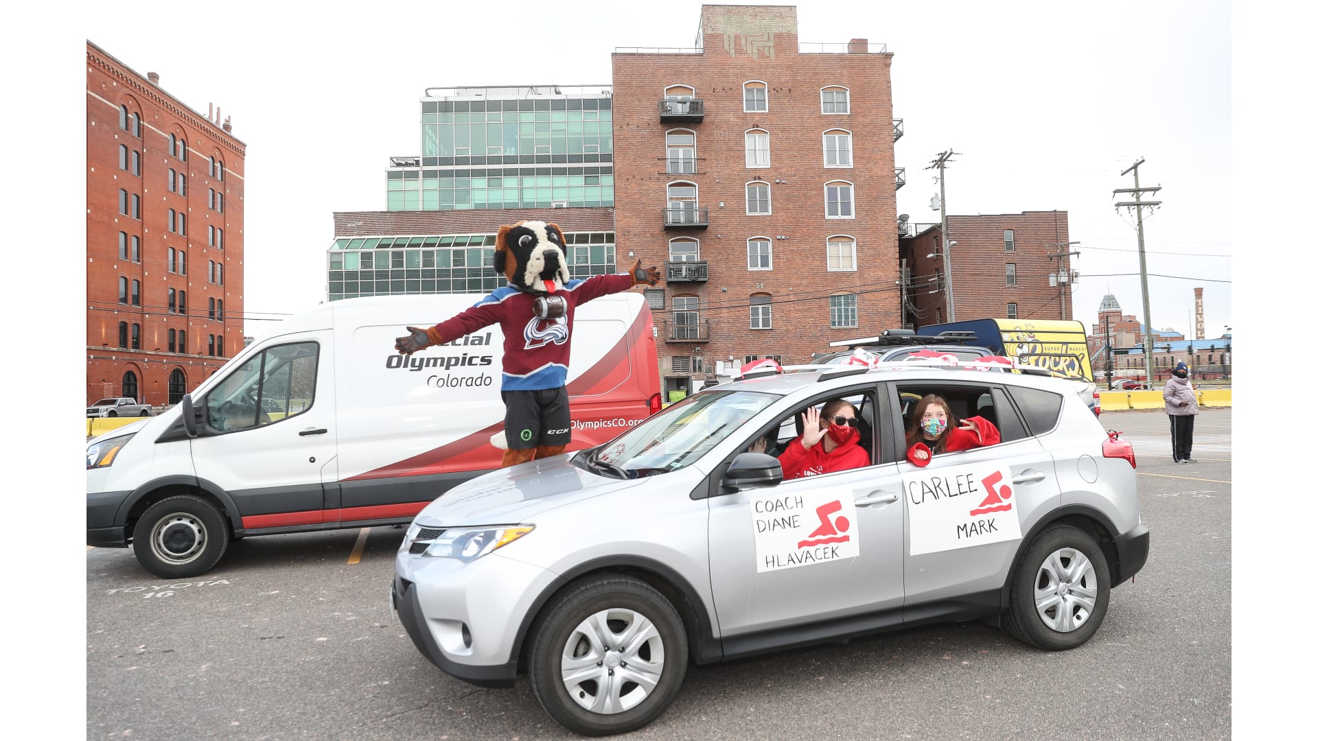 Colorado Special Olympics athletes joined the Colorado Avalanche mascot Bernie, Denver Nuggets mascot Rocky and Colorado Rapids mascot RapidMan in a drive-thru event. The athletes participated in a virtual camp earlier this fall and celebrated being able to come together.
