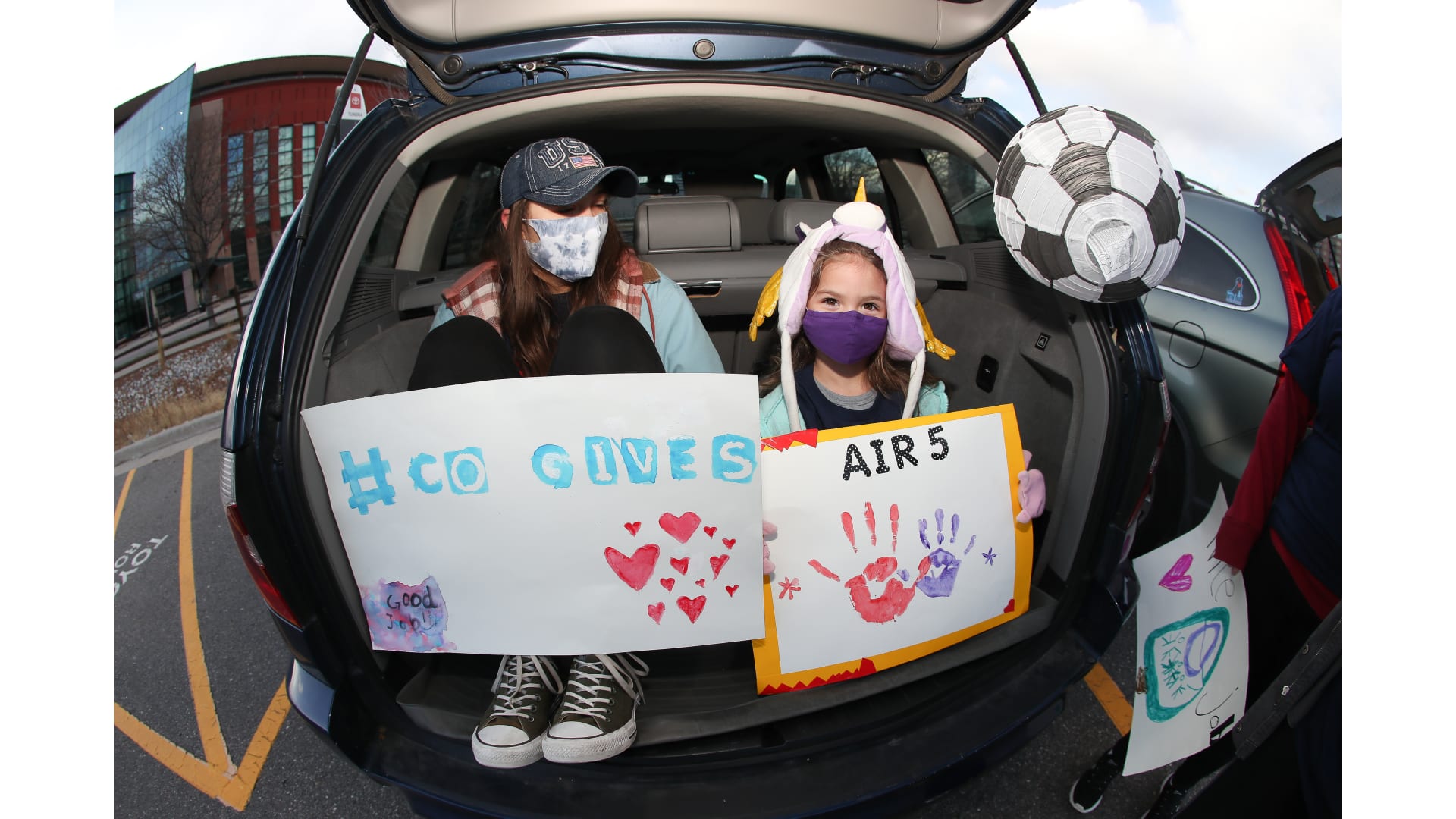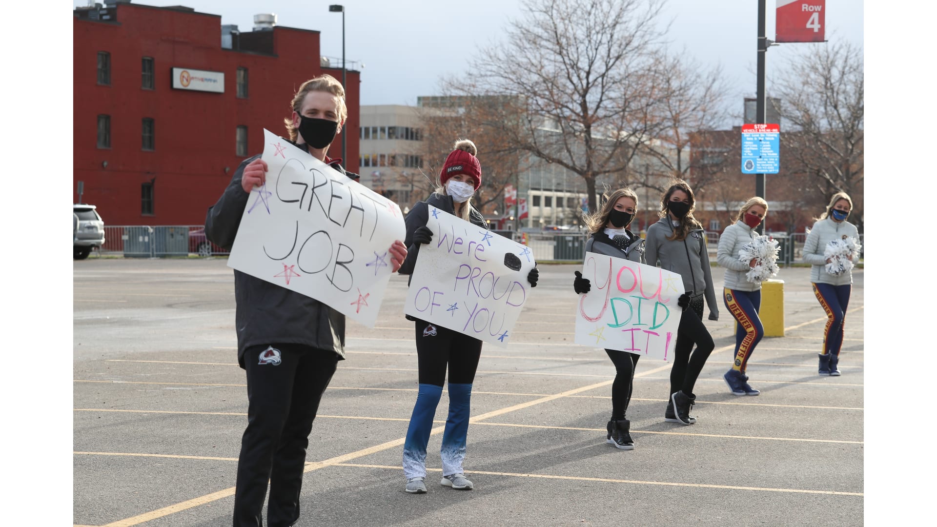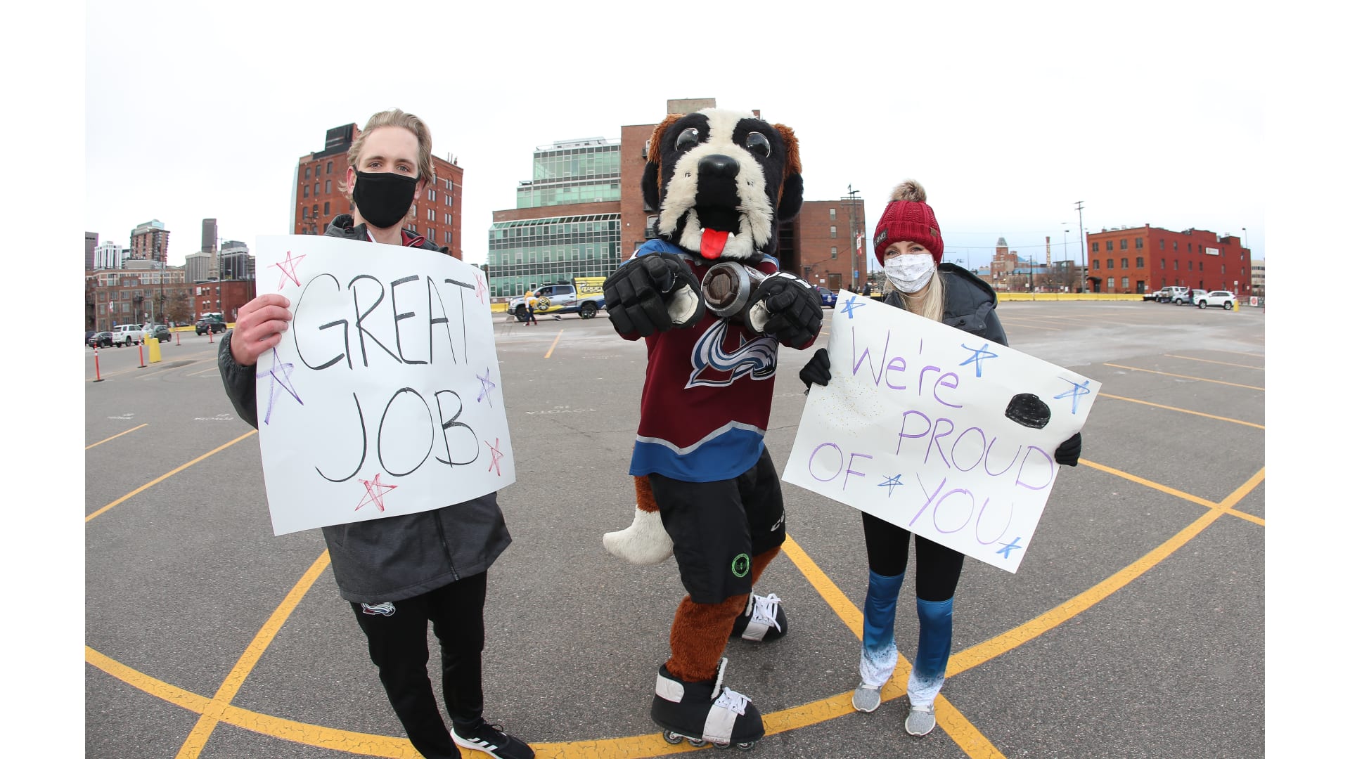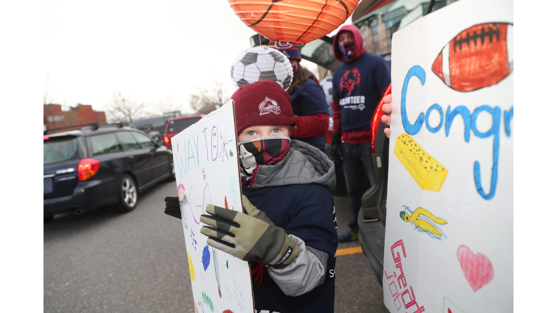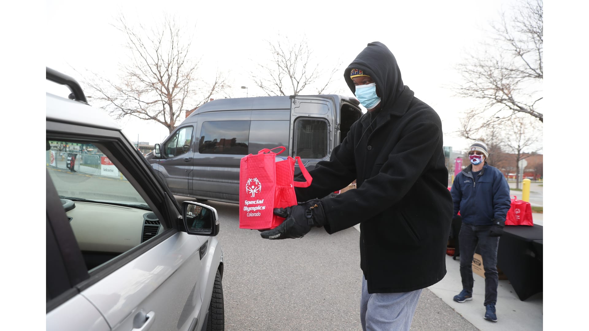 Colorado Special Olympics athletes joined the Colorado Avalanche mascot Bernie, Denver Nuggets mascot Rocky and Colorado Rapids mascot RapidMan in a drive-thru event. The athletes participated in a virtual camp earlier this fall and celebrated being able to come together.