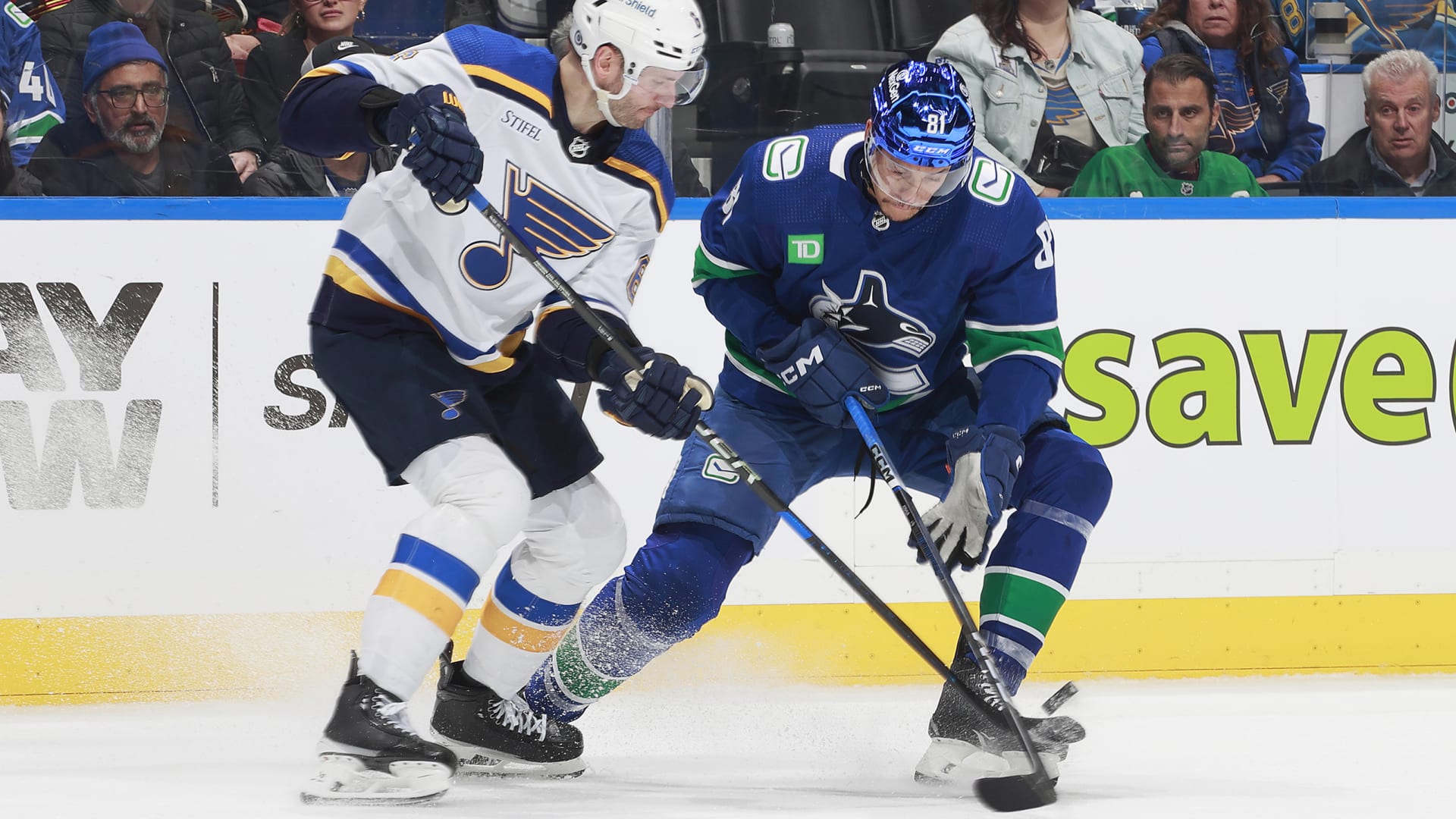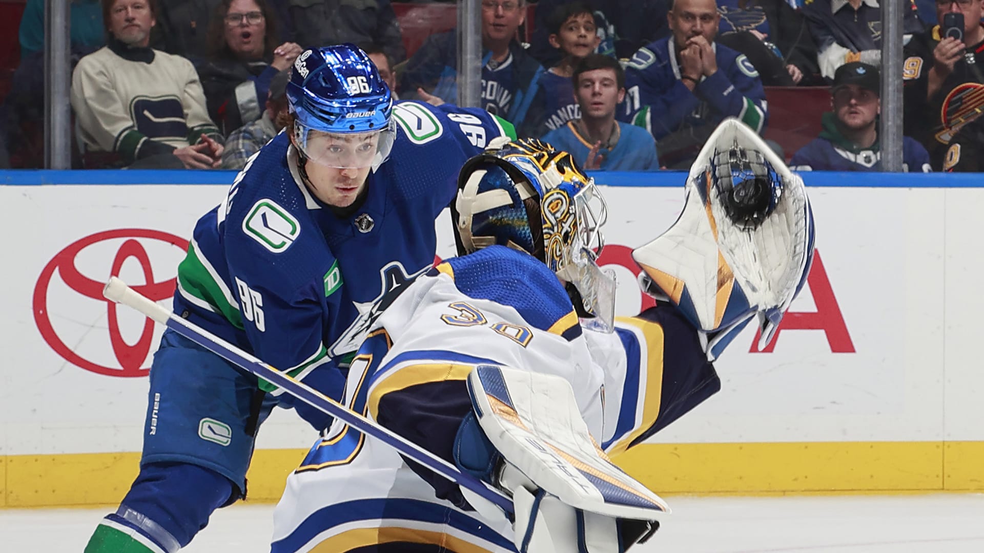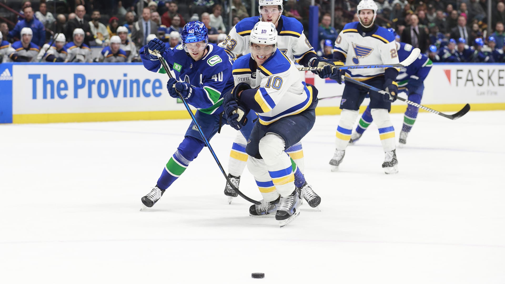 The St. Louis Blues beat the Vancouver Canucks 4-3 in overtime at Rogers Arena on Jan. 24, 2024. (Photos: Getty Images)
