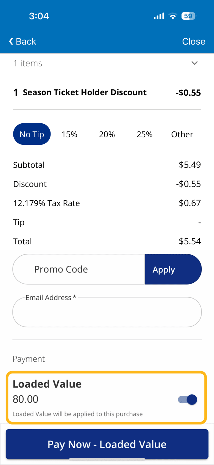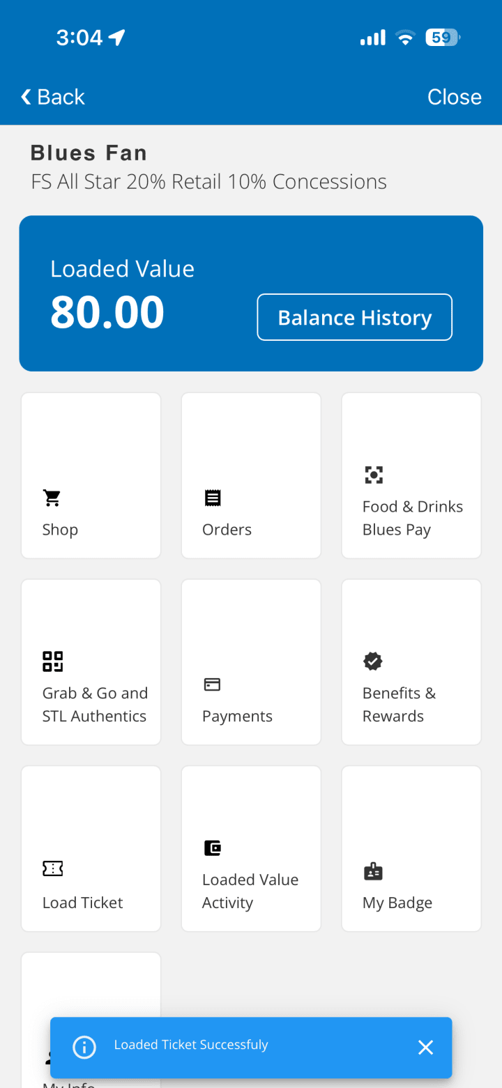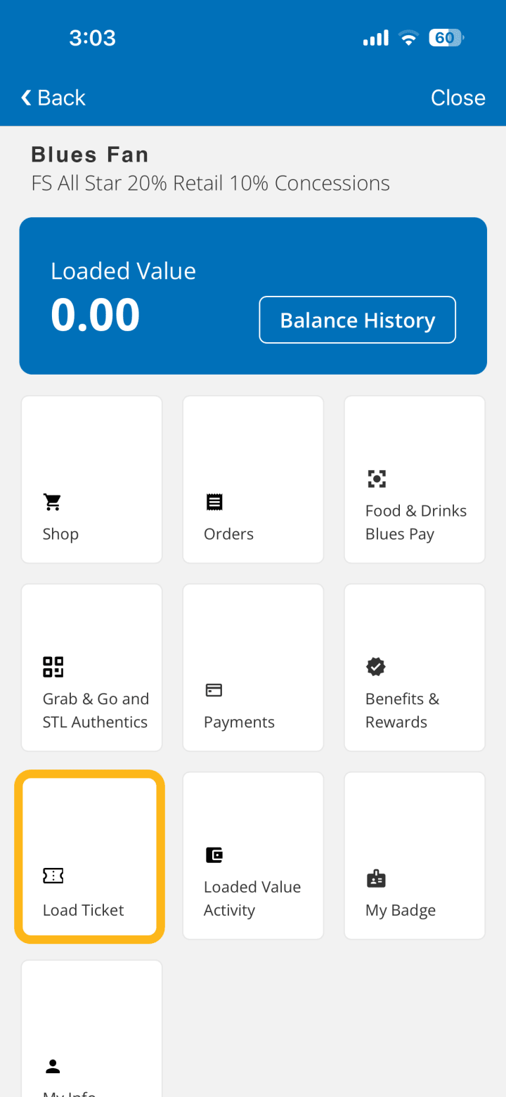 Please note: Loaded Value tied to an individual game ticket is only available for that game. Your remaining Loaded Value balance will not carry over for usage at future Blues games.