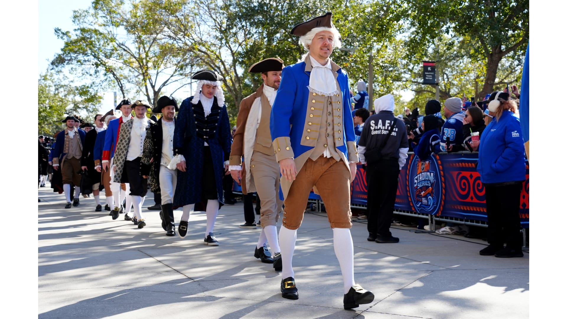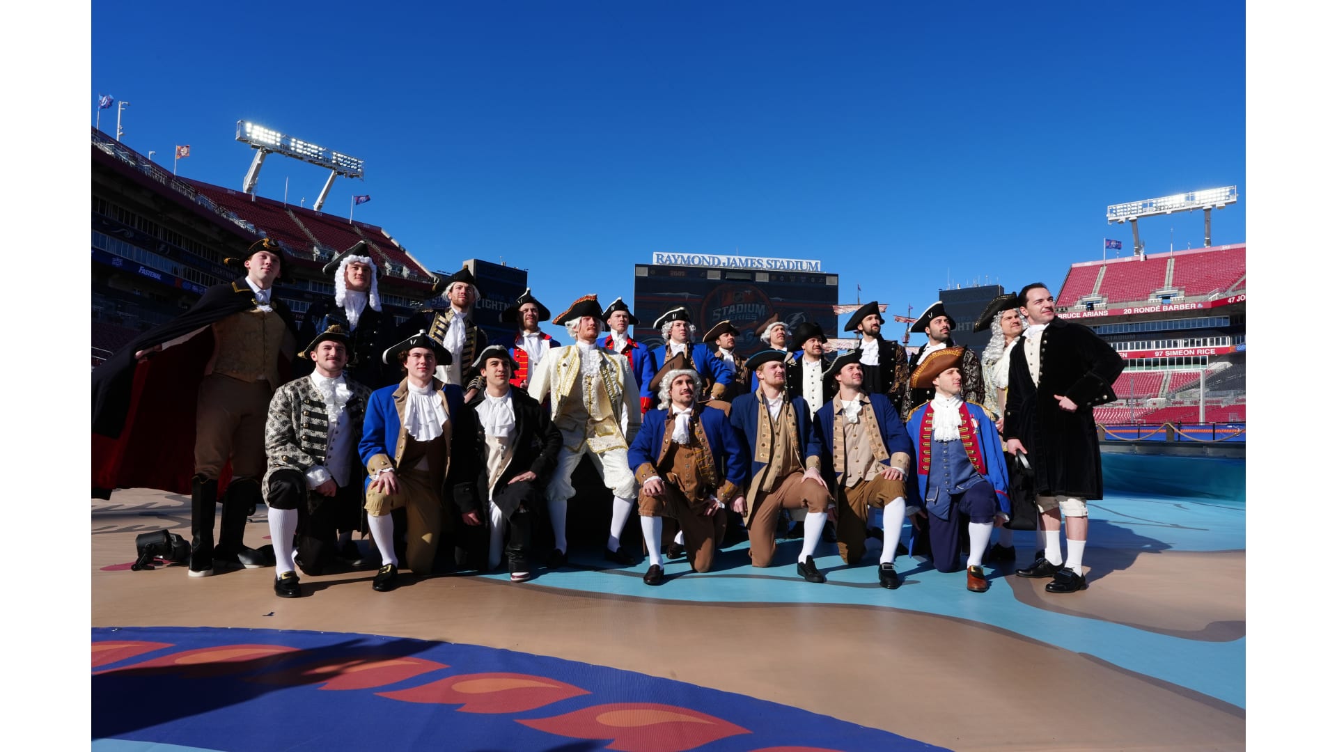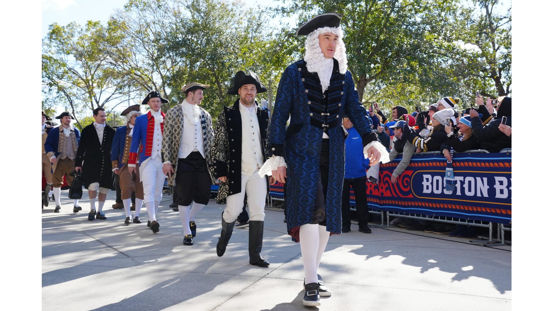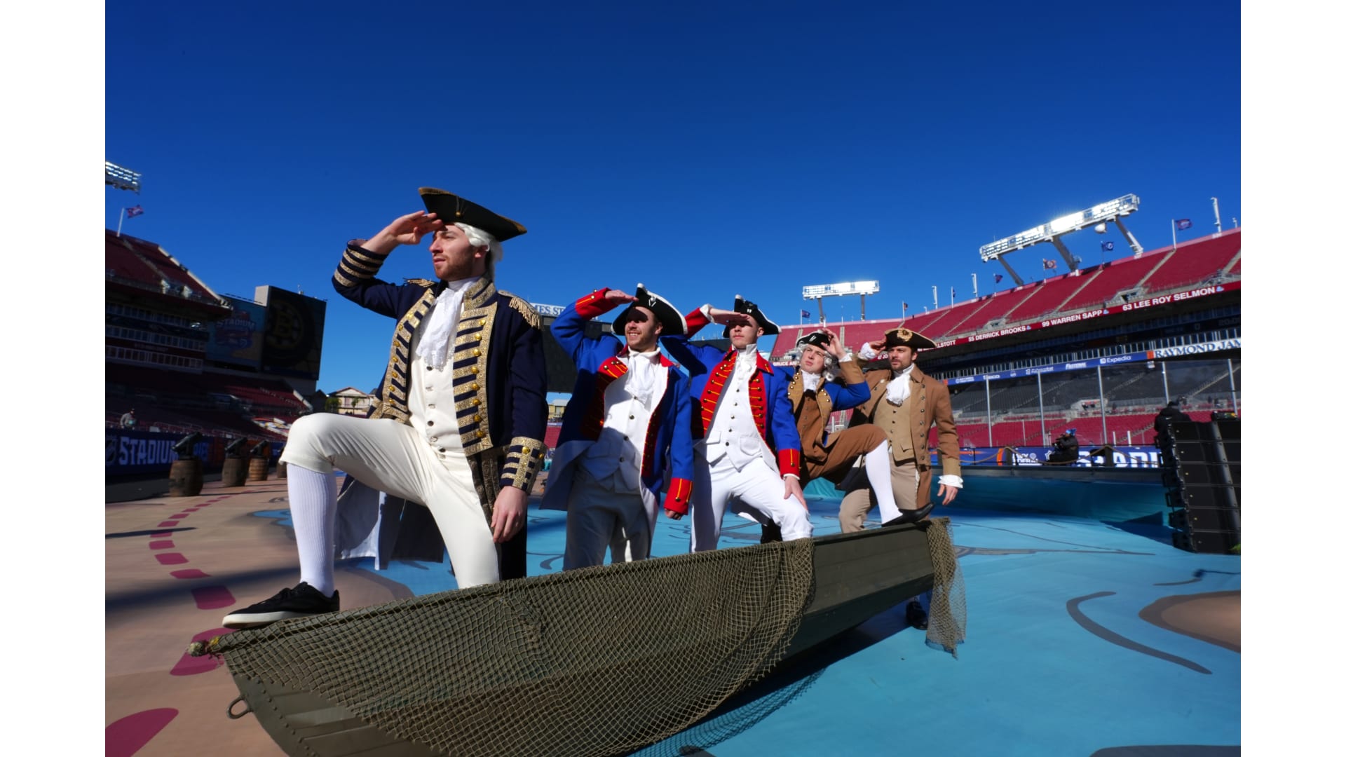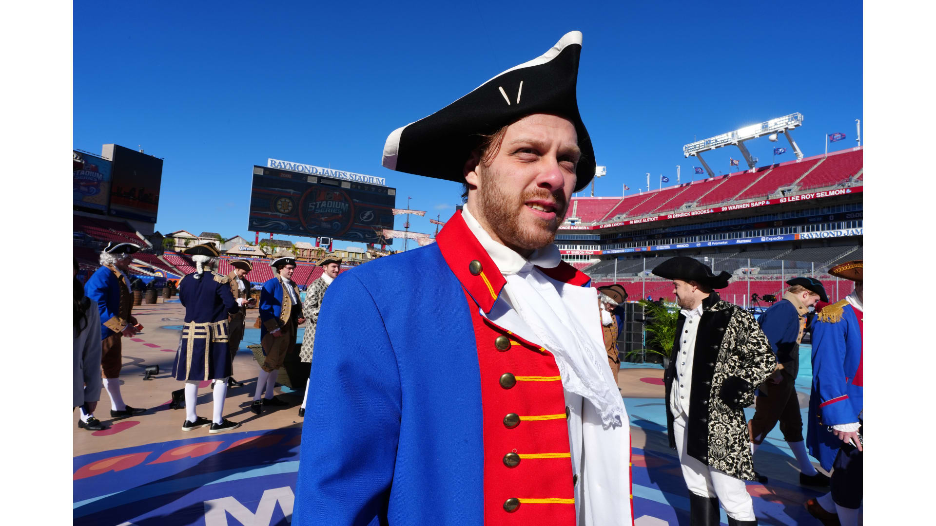 The Bruins wore patriot inspired revolutionary outfits to arrive for the Stadium Series game in Tampa Bay.