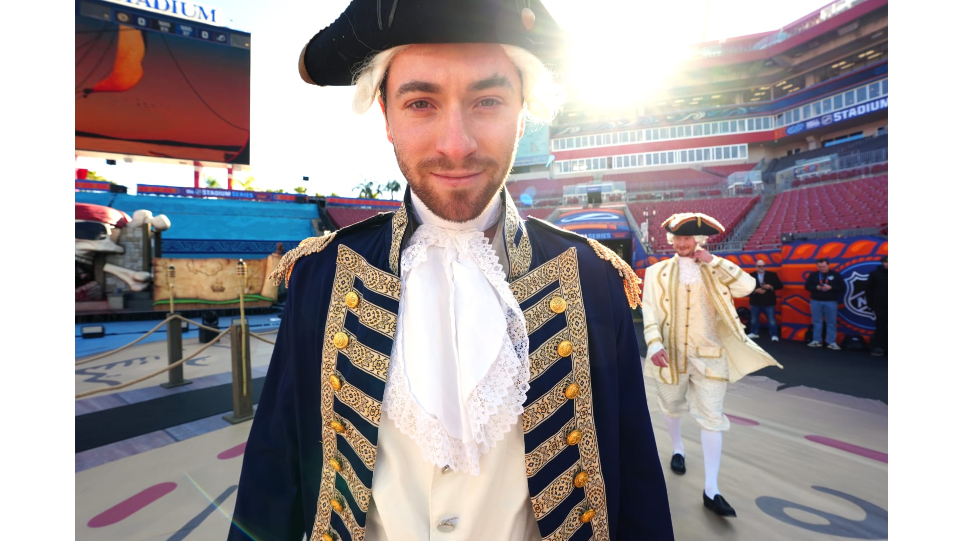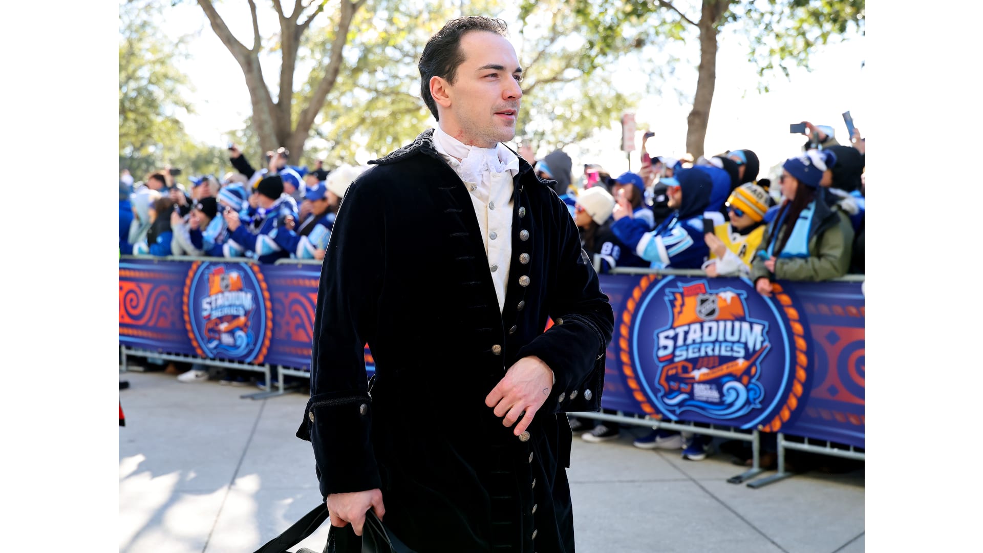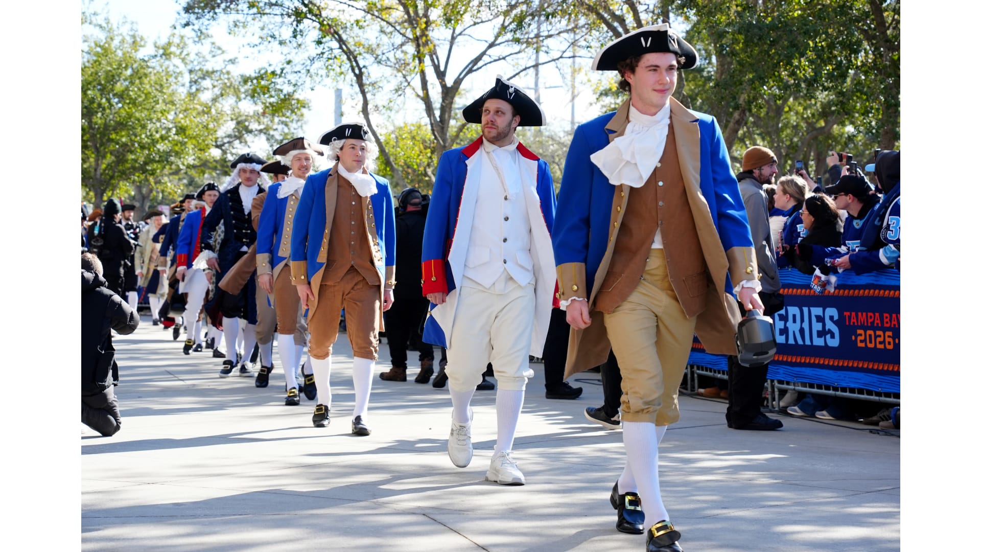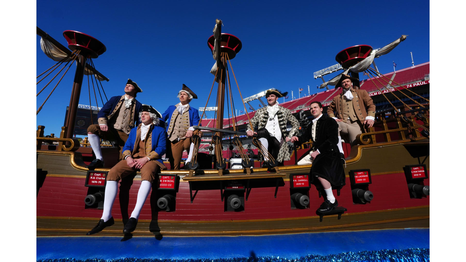 The Bruins wore patriot inspired revolutionary outfits to arrive for the Stadium Series game in Tampa Bay.