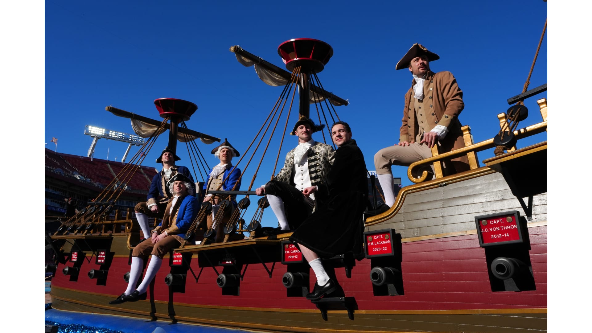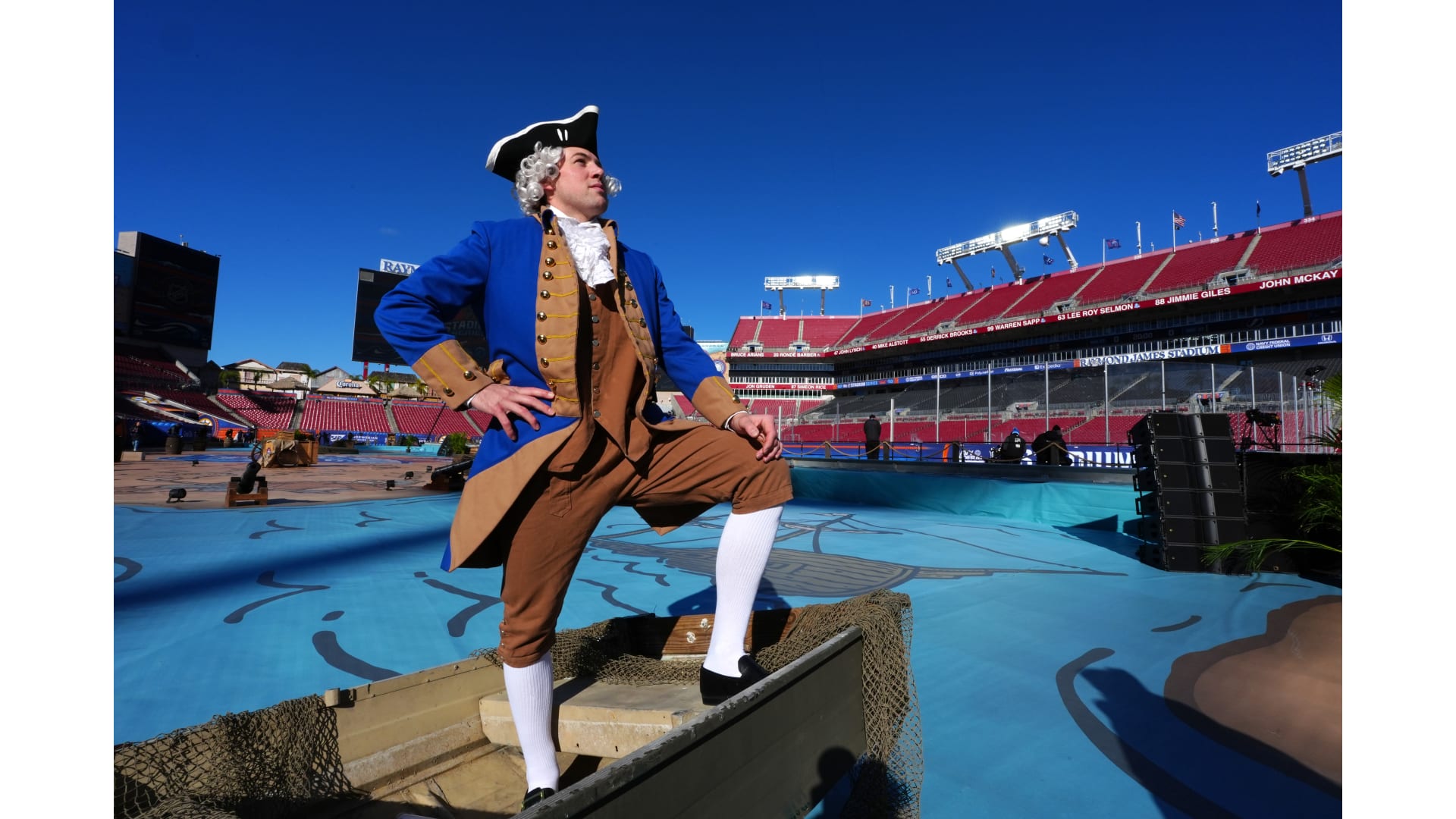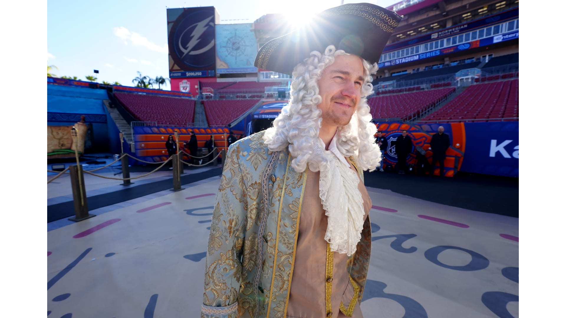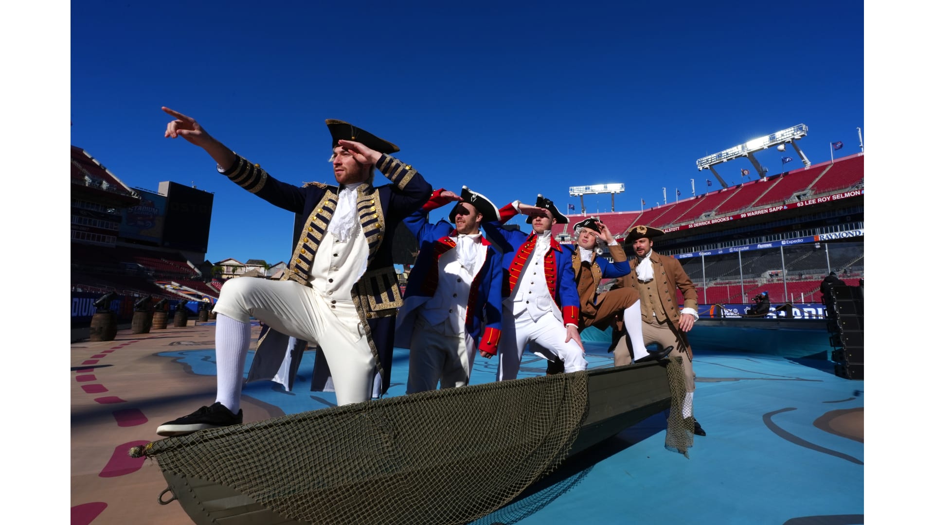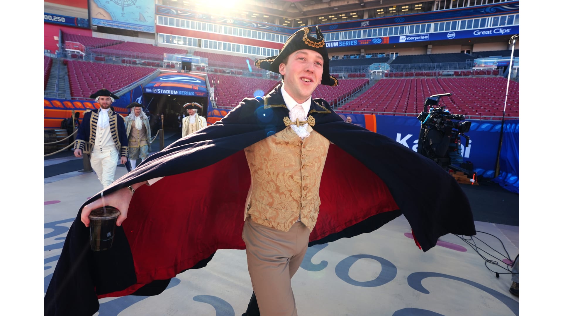 The Bruins wore patriot inspired revolutionary outfits to arrive for the Stadium Series game in Tampa Bay.
