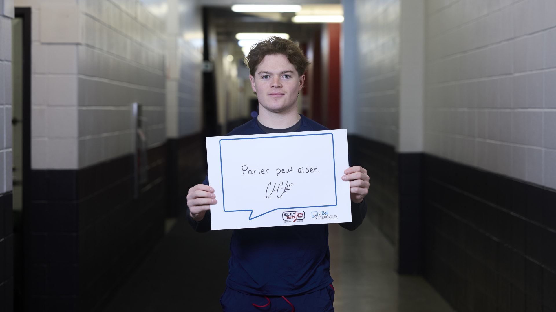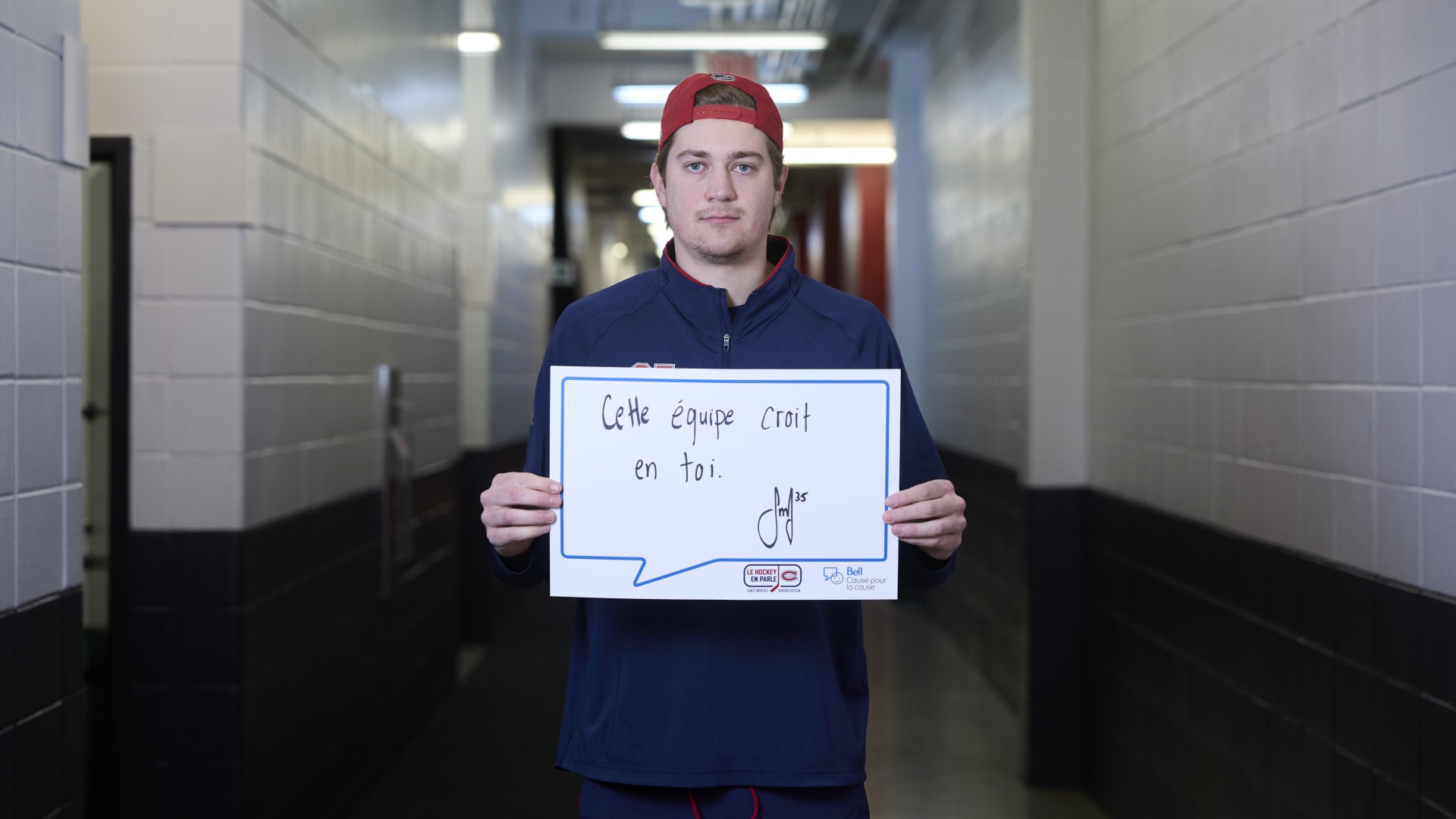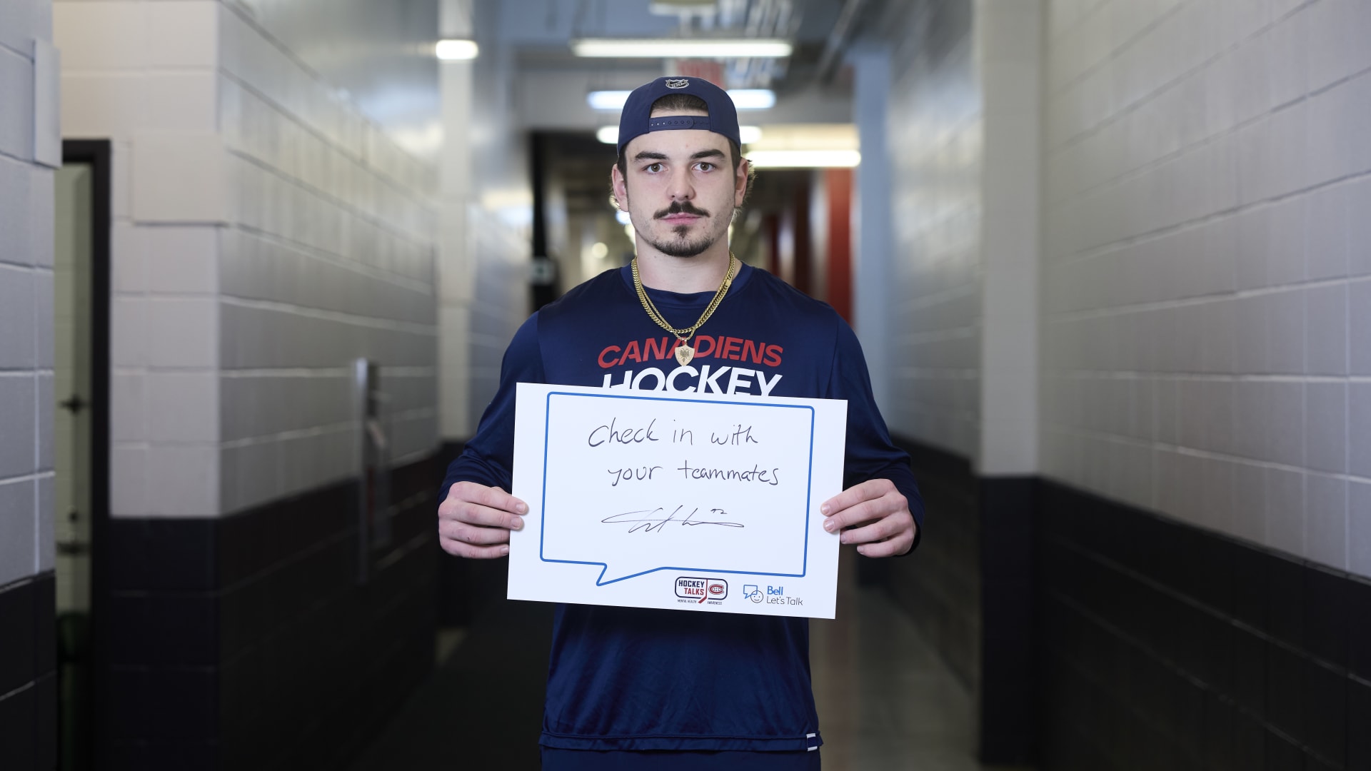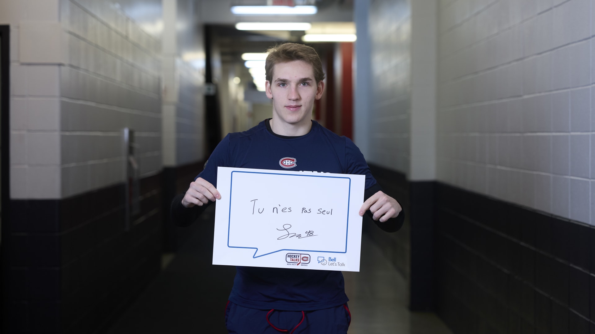 As part of the NHL's Hockey Talks initiative highlighting mental health awareness, Canadiens players hold up handwritten signs featuring personalized messages of support.