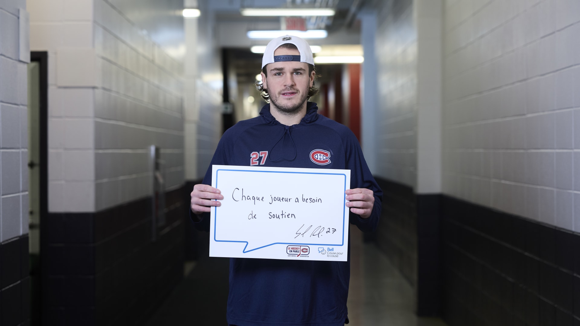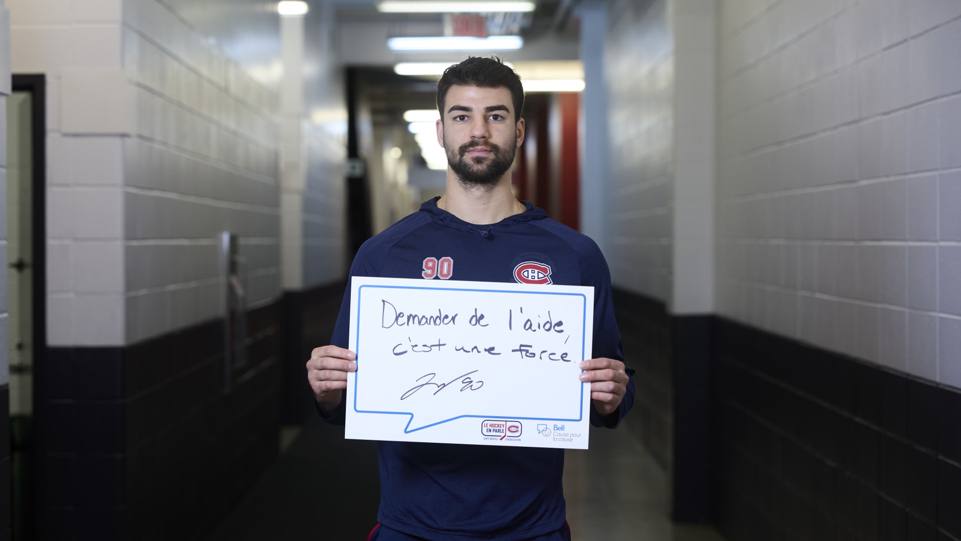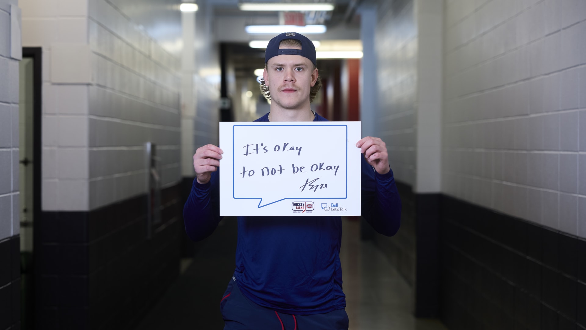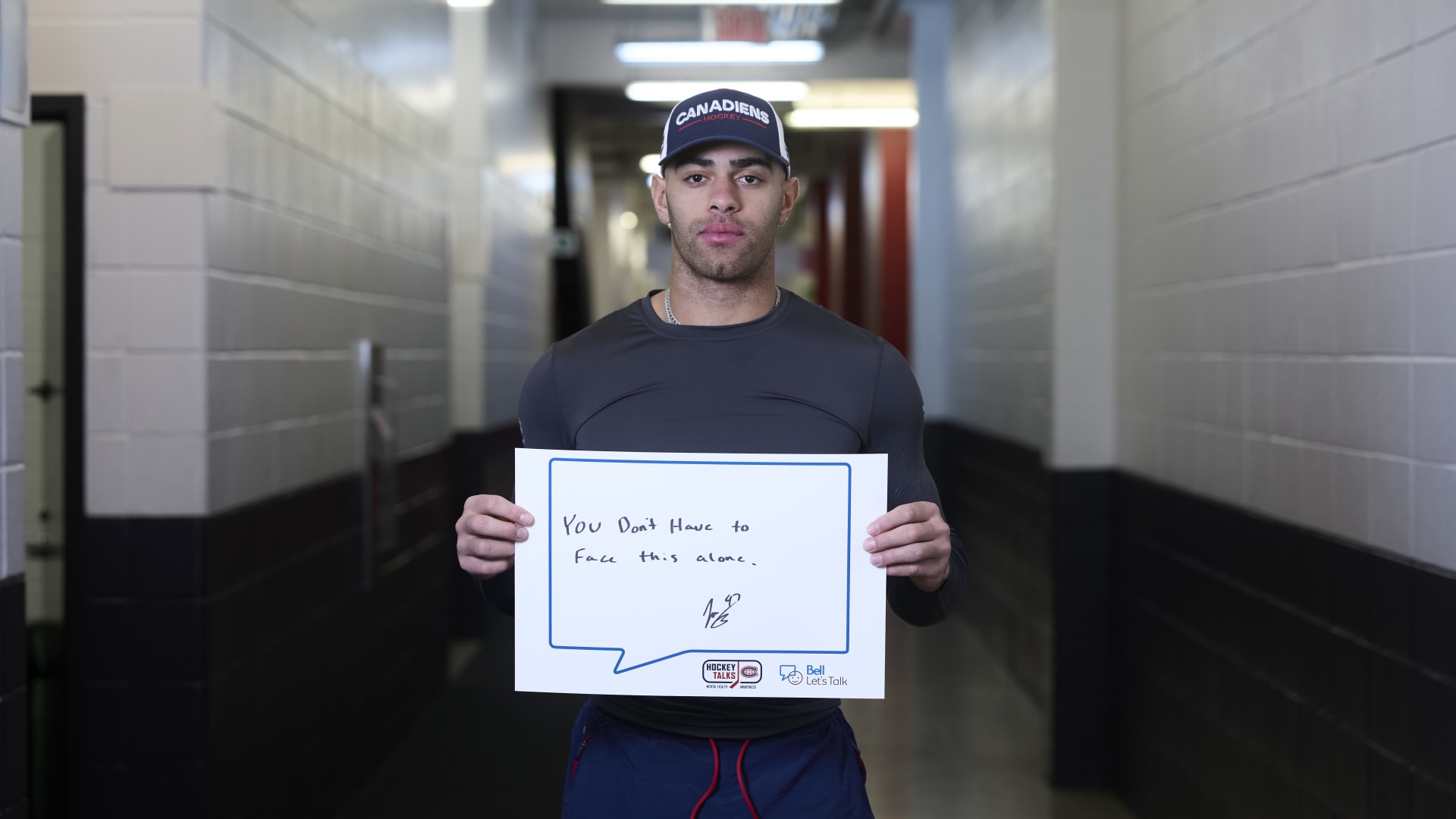 As part of the NHL's Hockey Talks initiative highlighting mental health awareness, Canadiens players hold up handwritten signs featuring personalized messages of support.