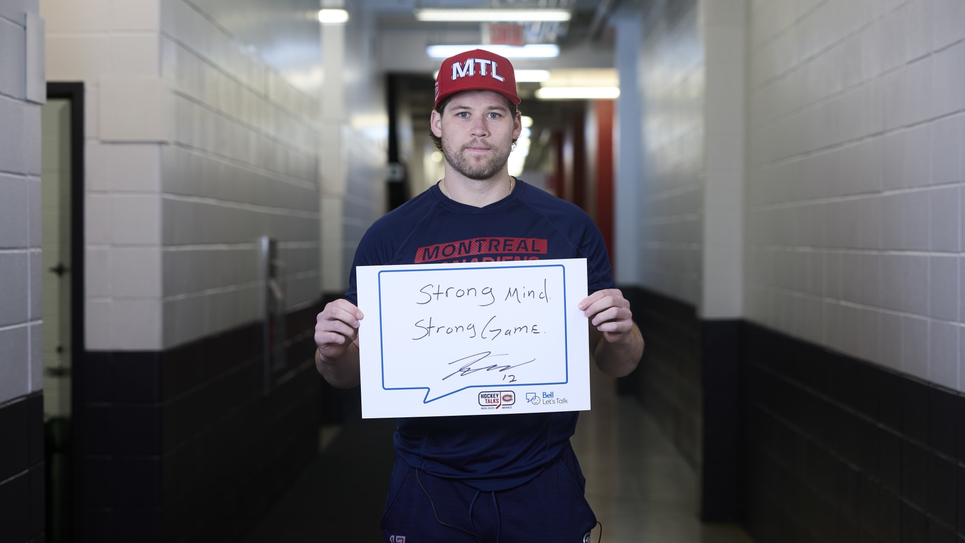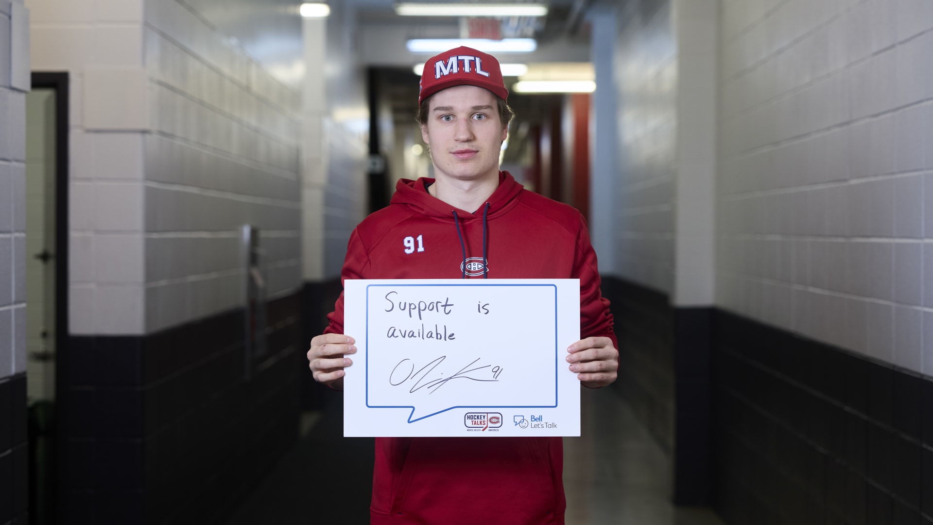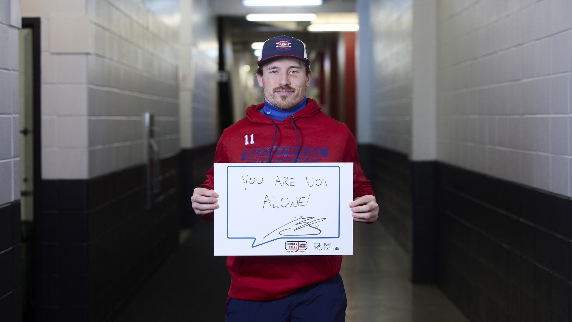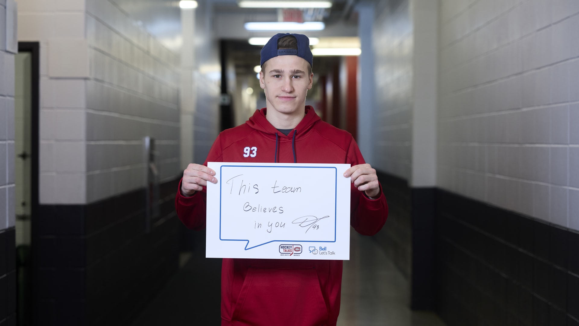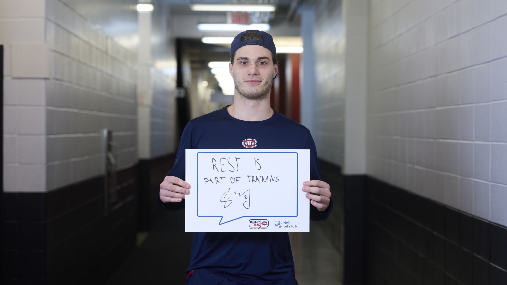 As part of the NHL's Hockey Talks initiative highlighting mental health awareness, Canadiens players hold up handwritten signs featuring personalized messages of support.