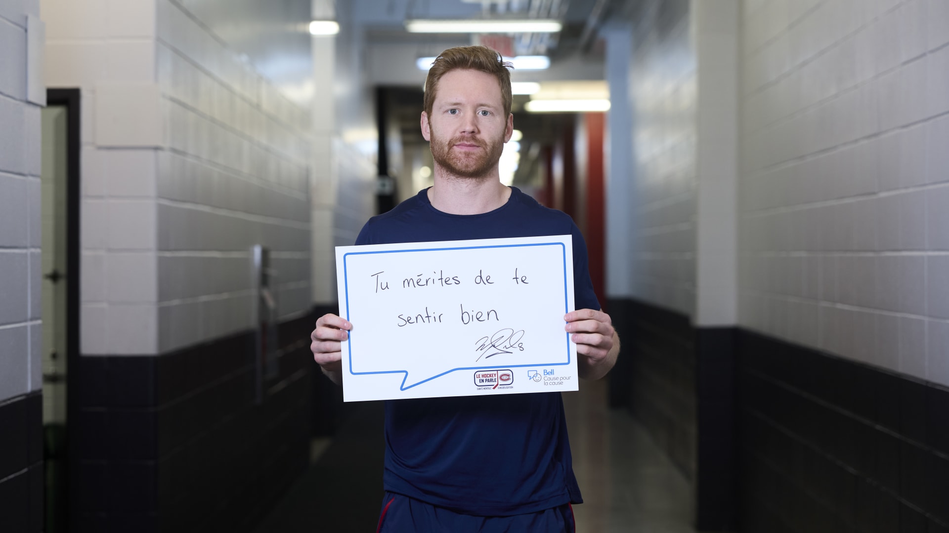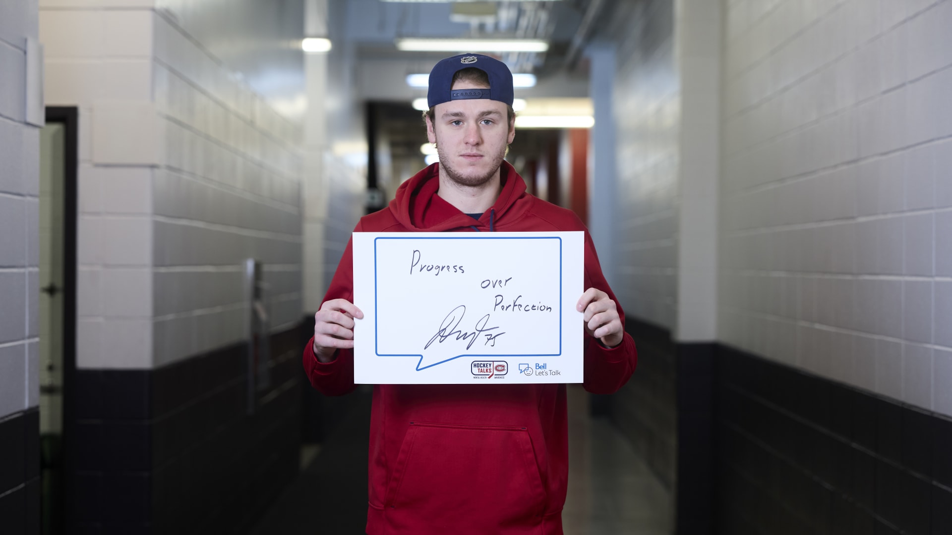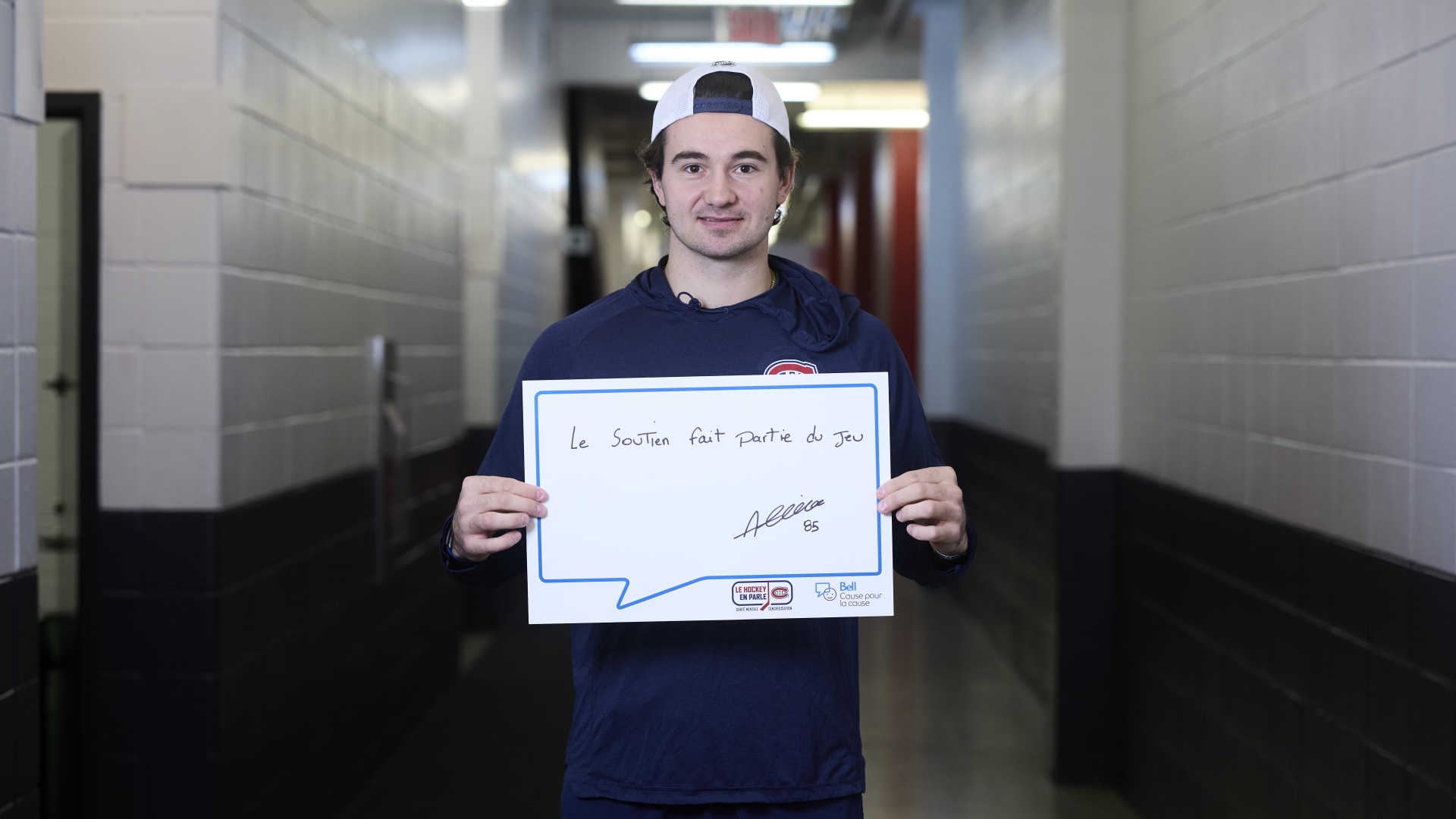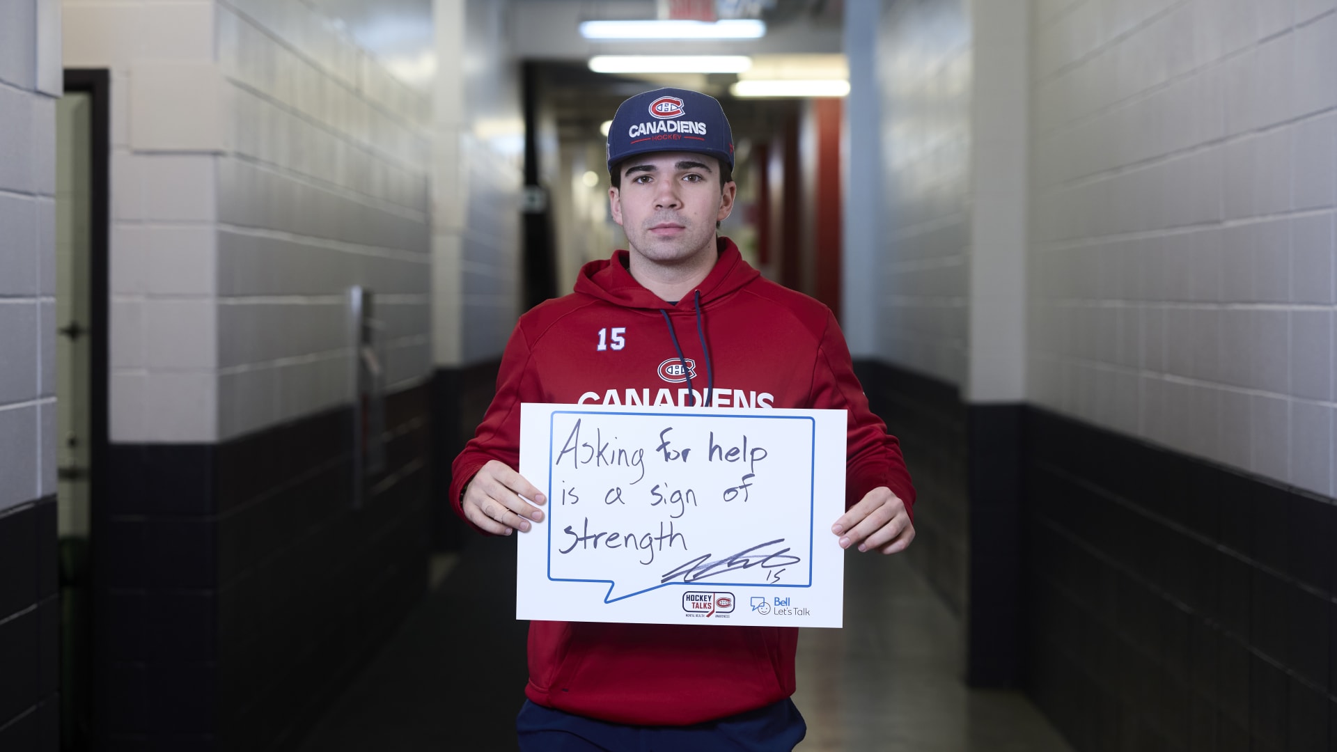 As part of the NHL's Hockey Talks initiative highlighting mental health awareness, Canadiens players hold up handwritten signs featuring personalized messages of support.