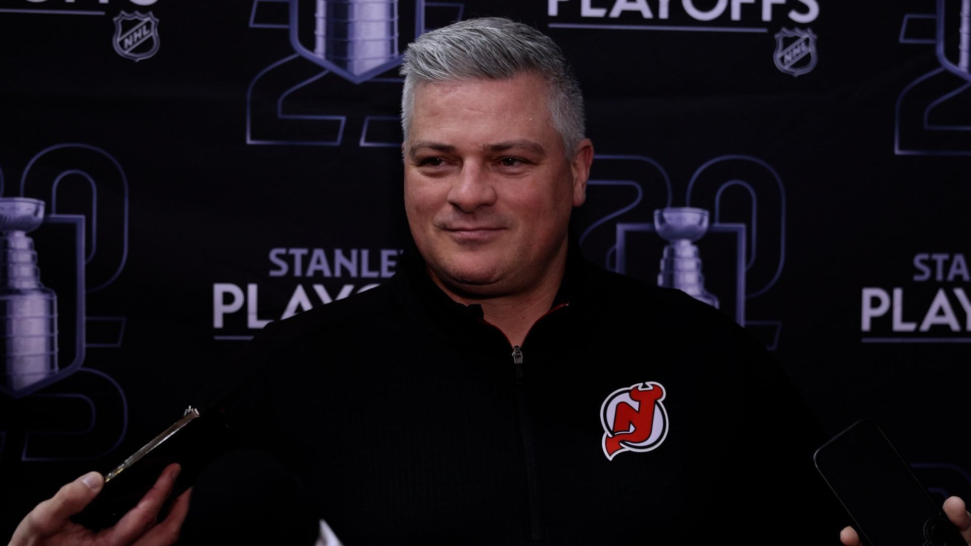 Devils head coach Sheldon Keefe speaks to the media.
