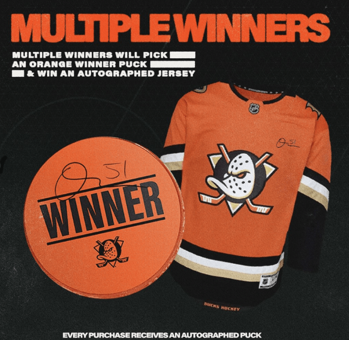 This annual fan-favorite fundraiser will feature a commemorative Orange Country surprise puck for sale for $30 each and will be sold on a first come, first served basis, while supplies last. All pucks are autographed, individually wrapped and selected at random. Fans will receive either a Ducks player-autographed commemorative puck or a surprise Ducks player-autographed orange puck. The lucky winners of the Surprise Puck Sale will receive an autographed Anaheim Ducks jersey by the player who signed the orange puck.
