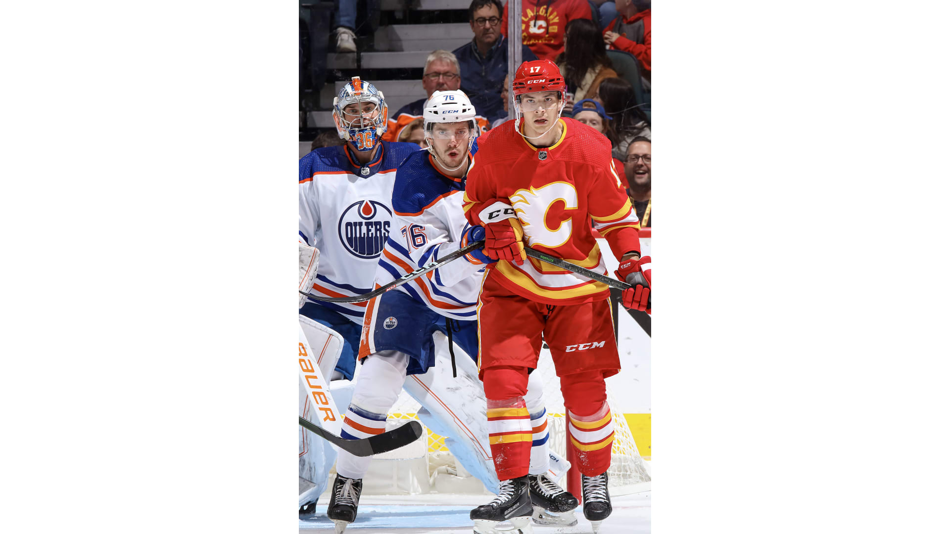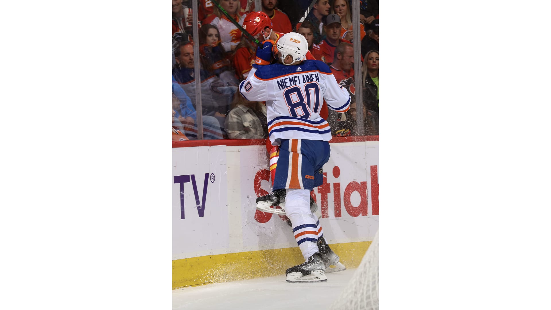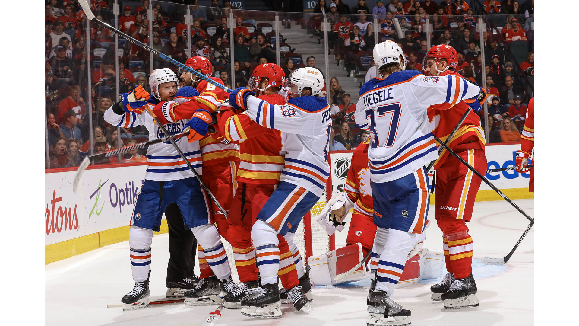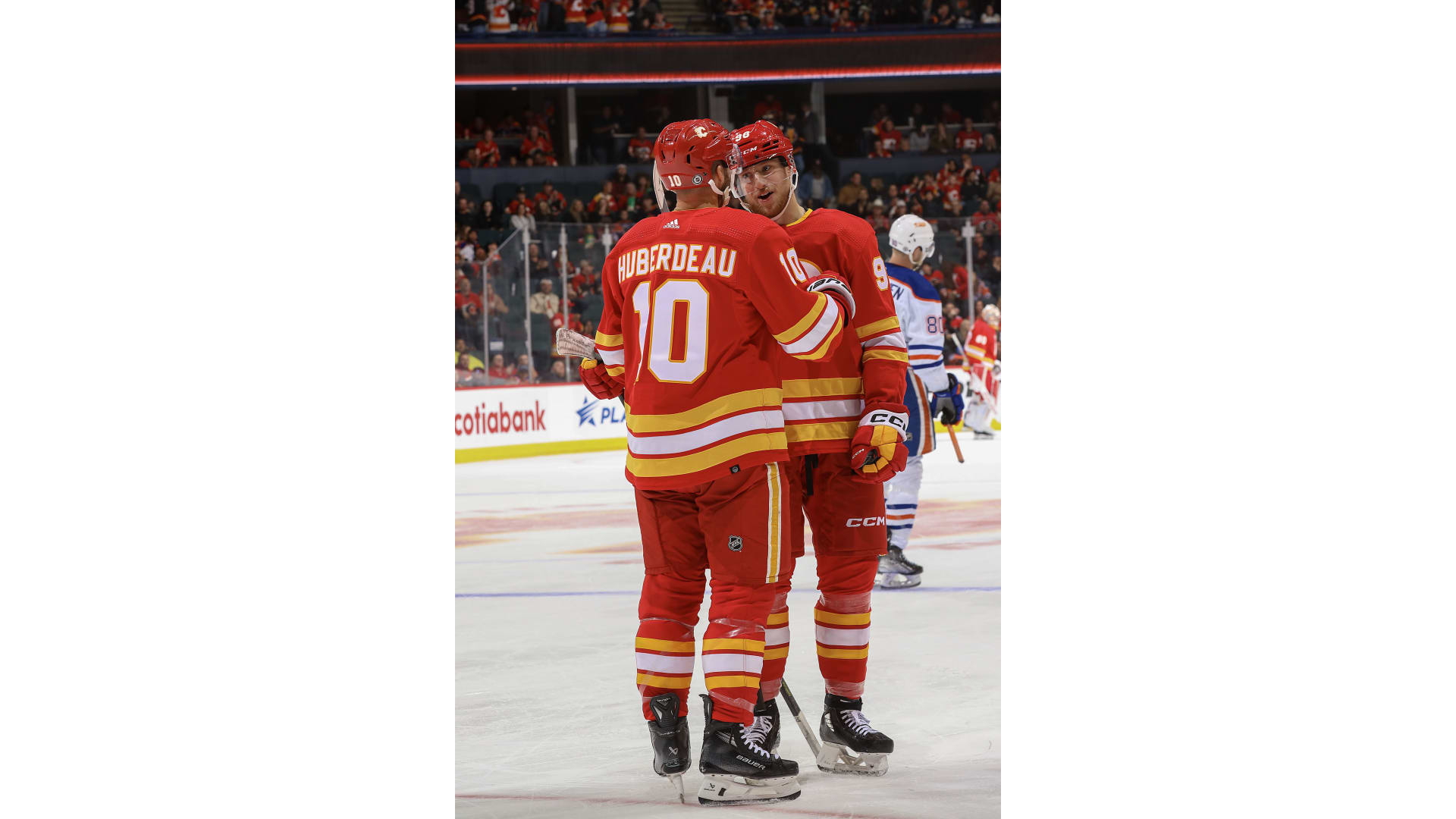 The Flames challenged saying Coleman was pushed into the blue paint and Edmonton goalie Jack Campbell but after review, the call stood.
