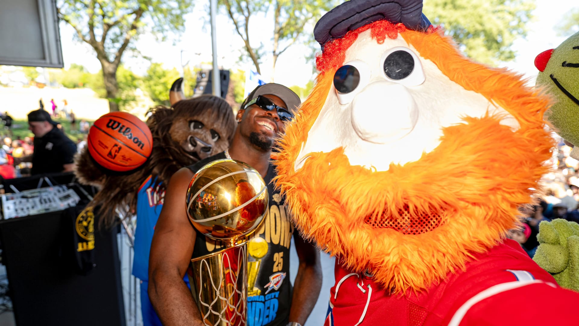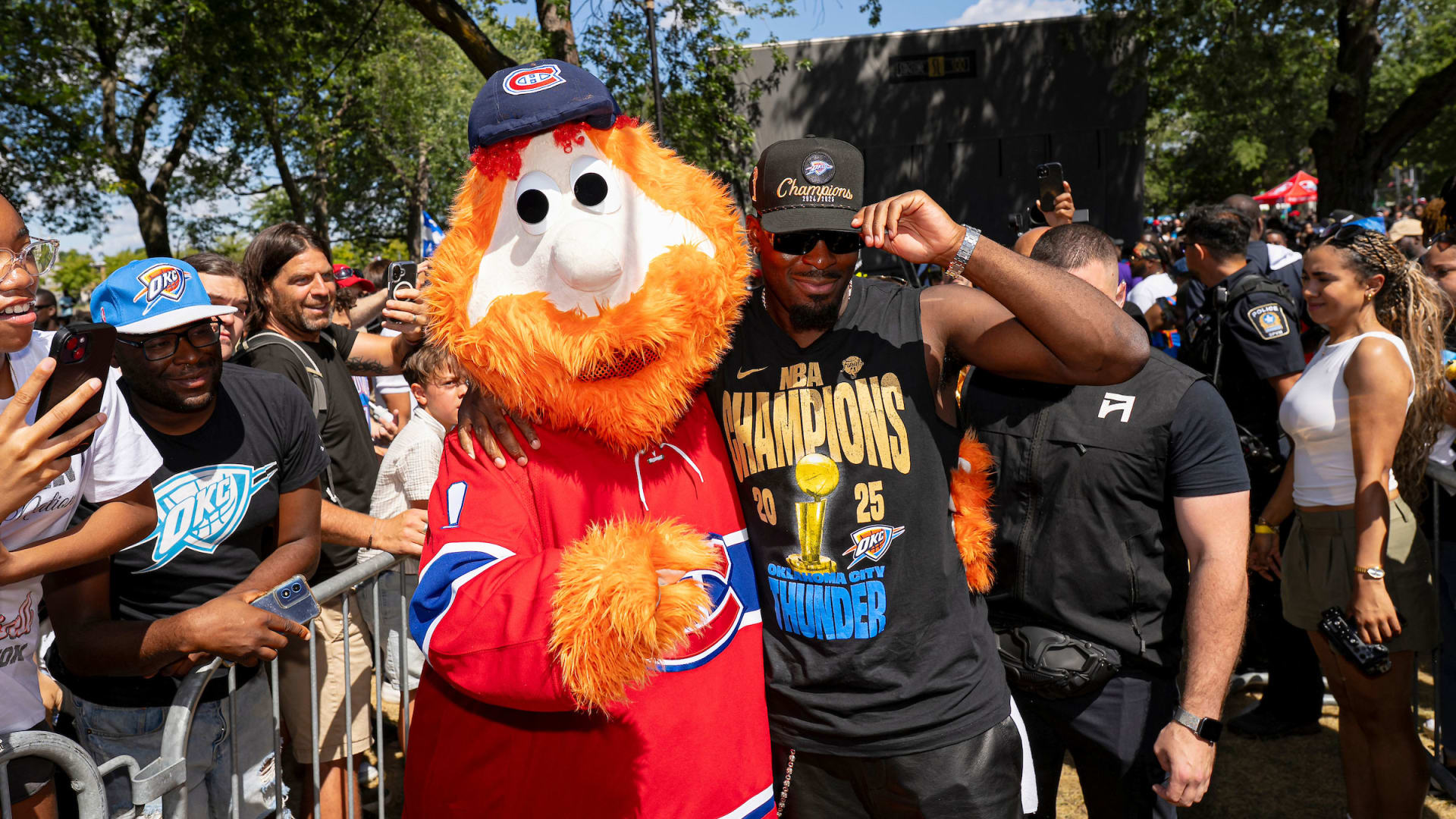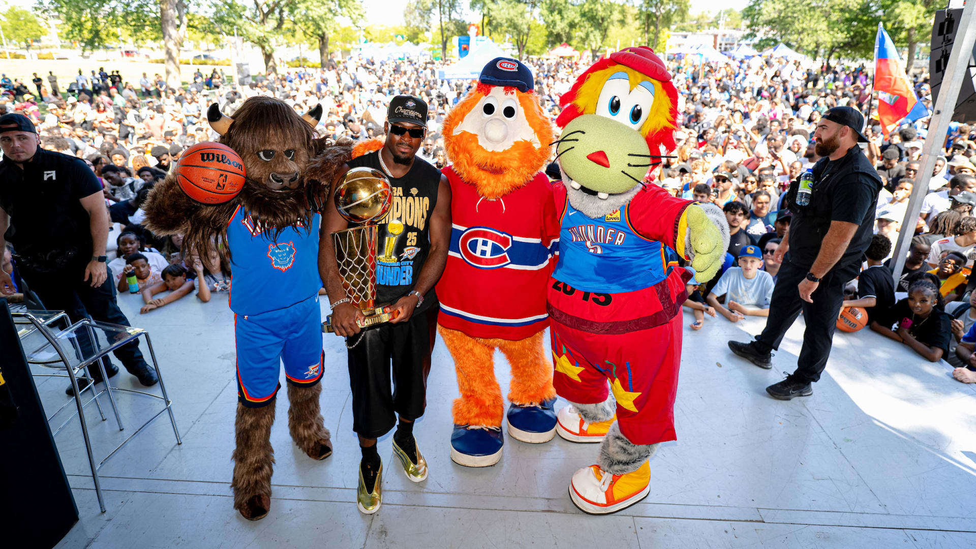 Youppi! se joint aux festivités célèbrant le champion de la NBA Lu Dort à Montréal-Nord, en compagnie de Rumble the Bison, la mascotte du Thunder d’Oklahoma City, et le trophée Larry O’Brien.