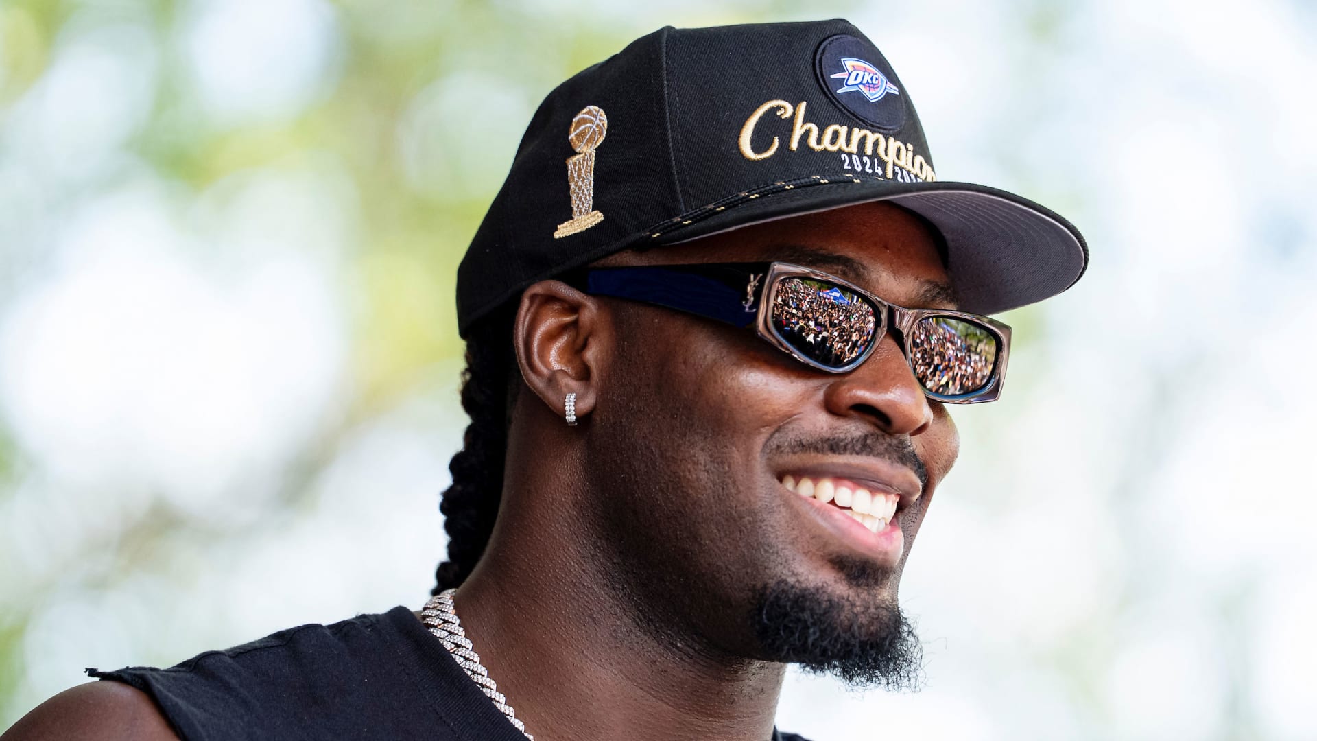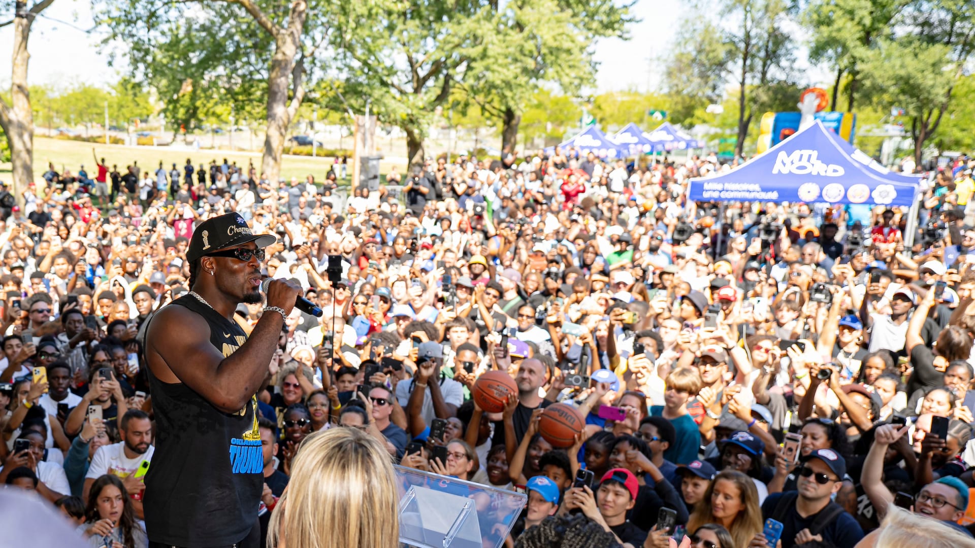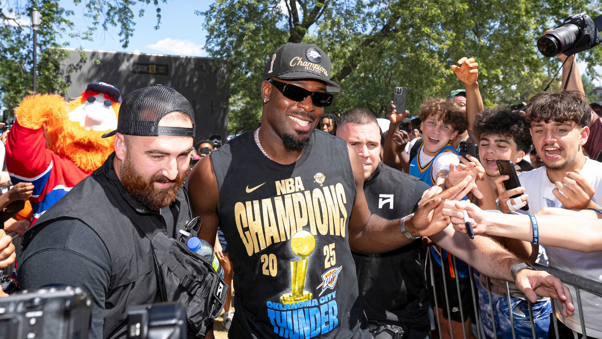 Youppi! se joint aux festivités célèbrant le champion de la NBA Lu Dort à Montréal-Nord, en compagnie de Rumble the Bison, la mascotte du Thunder d’Oklahoma City, et le trophée Larry O’Brien.