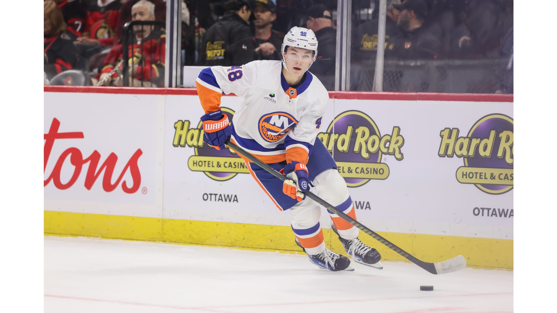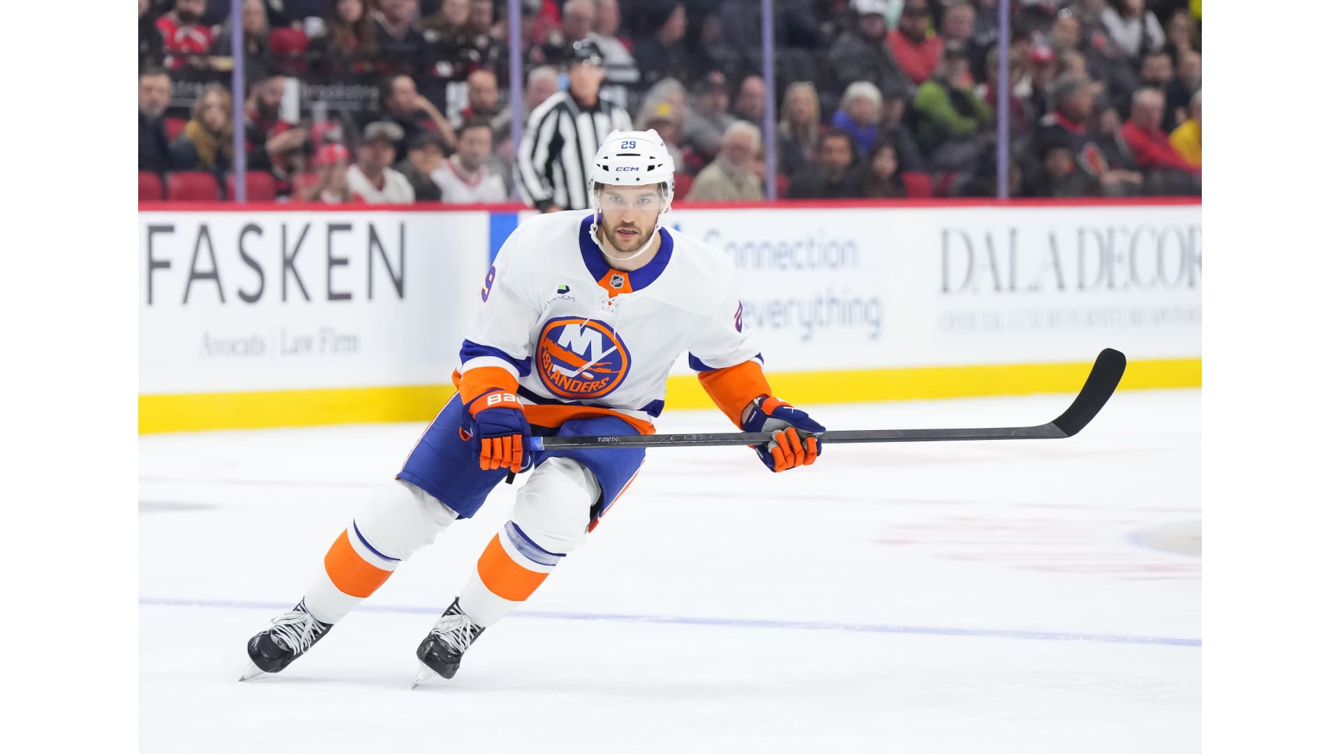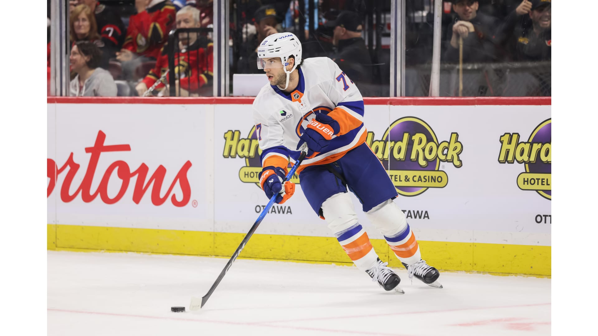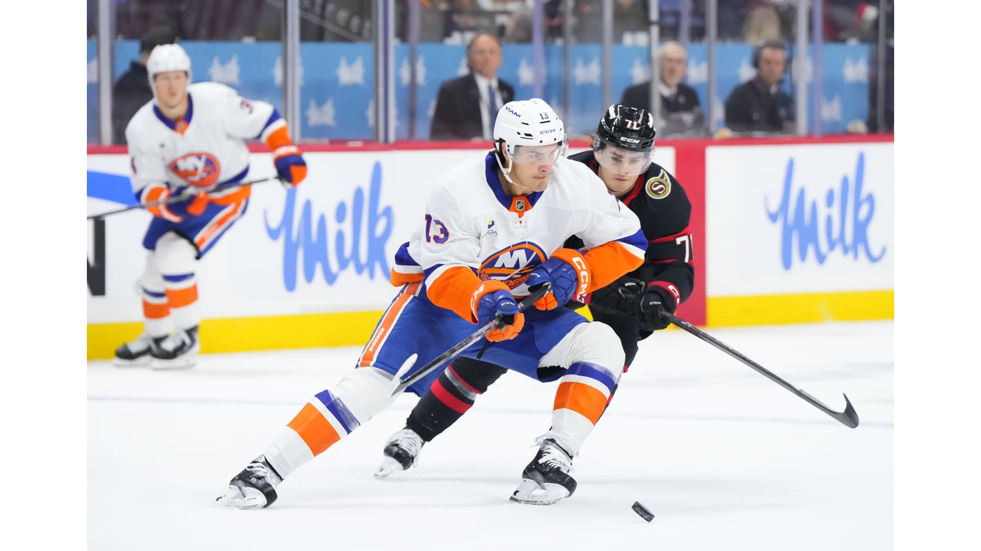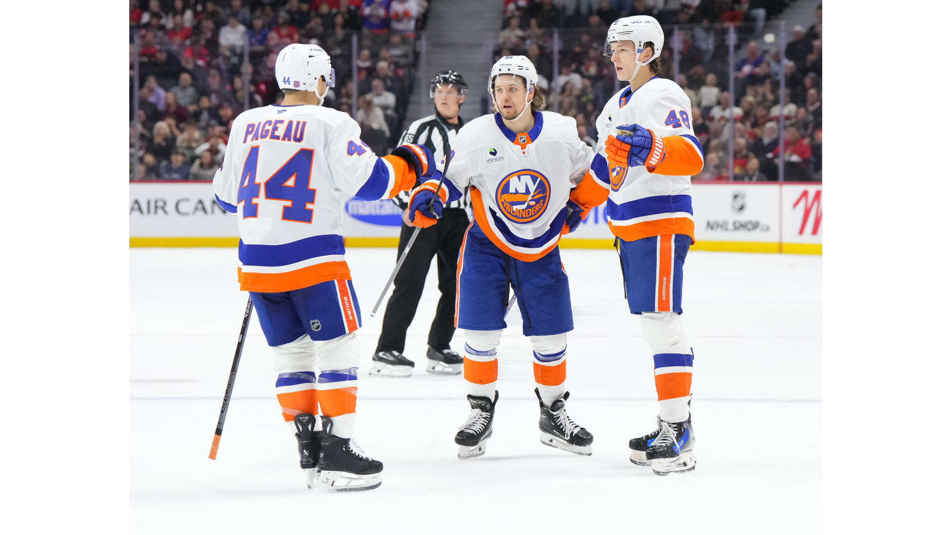 Snapshots from the New York Islanders 5-4 win over the Ottawa Senators at Canadian Tire Centre on Oct. 18, 2025. Photos by Andrea Cardin/NHLI via Getty Images, Richard A. Whittaker/Icon Sportswire via Getty Images, and Kathryn Howell/New York Islanders.