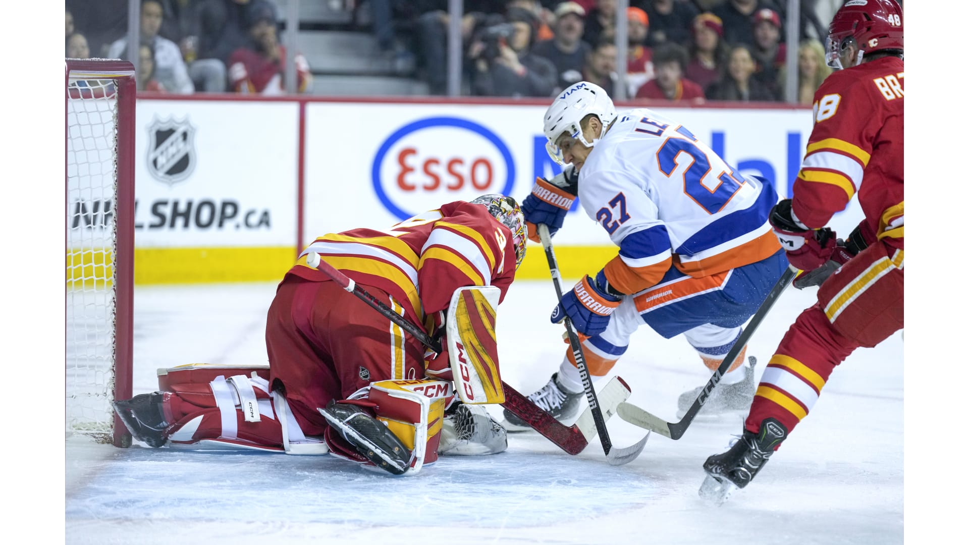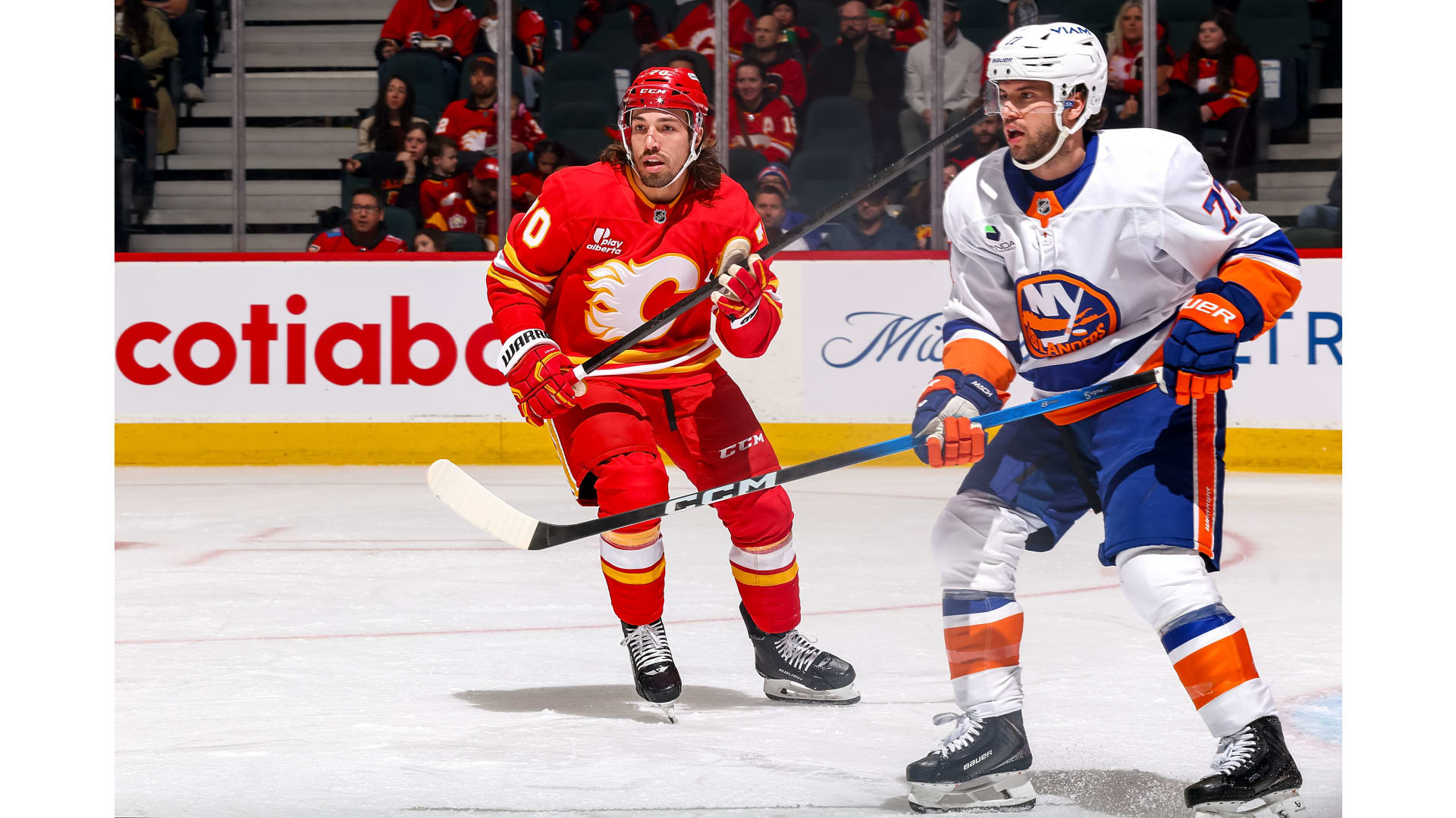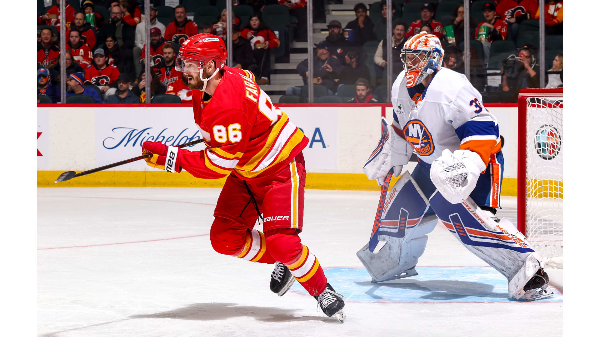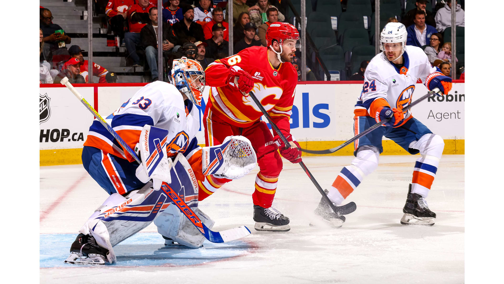 JG Pageau scored for the Islanders, but only after the Flames established a 4-0 lead. Yegor Sharangovich, Adam Klapka, Justin Kirkland and Yan Kuznetsov scored for the Flames. Anders Lee rounded out the scoring with his 300th career goal.