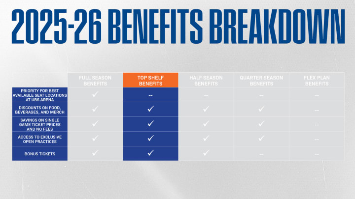 Only the best. The Top Shelf Plan includes 25 of the season’s premier games — the highest-demand matchups and most electric nights at UBS Arena. It’s the ultimate way to experience the Islanders without a full-season commitment. Flexible monthly payment options are available to fit your budget.